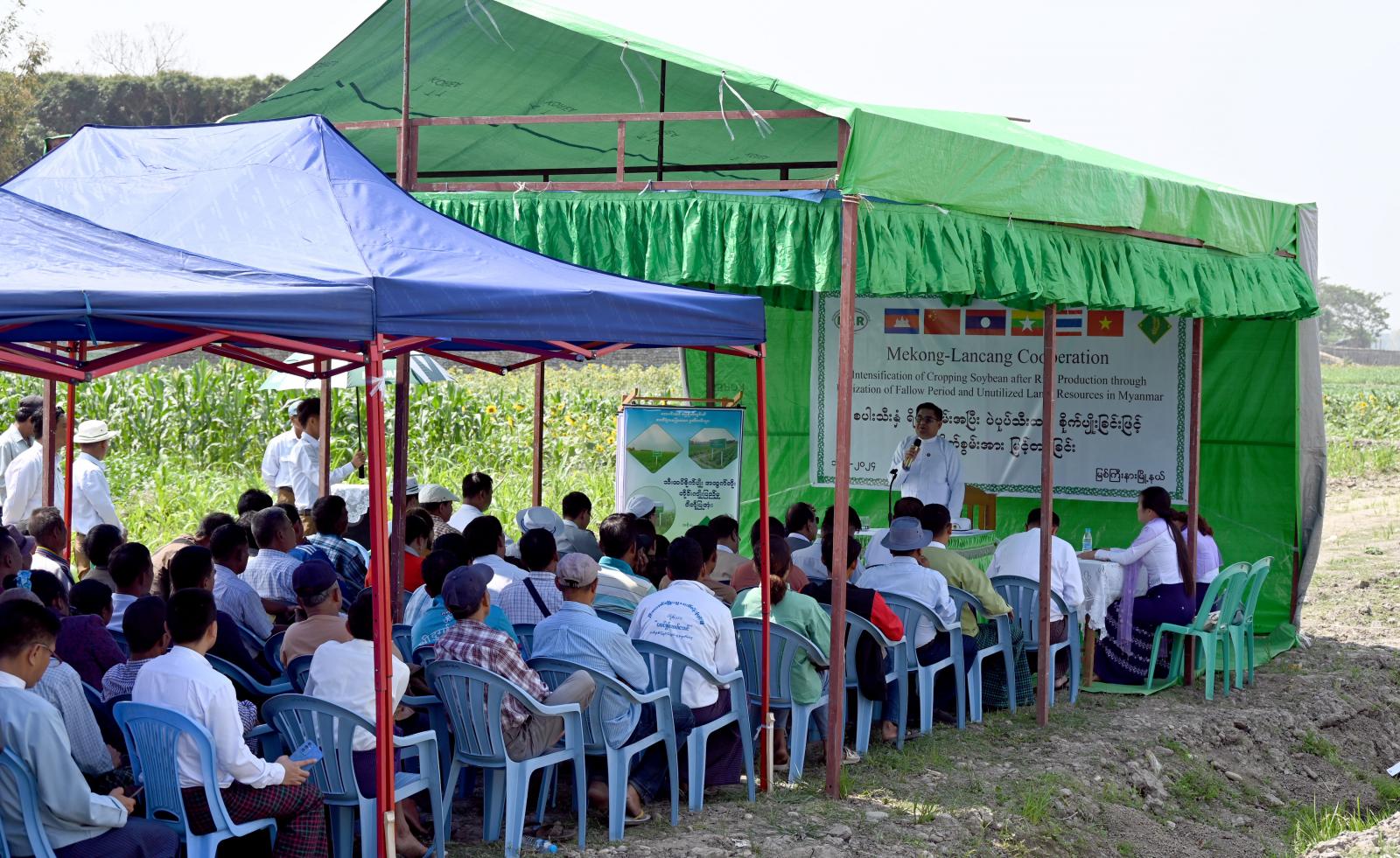 ရှေးဦးစွာ စံပြစိုက်ကွင်းအတွင်း တောင်သူများ၏လယ်၌ မဲခေါင်-လန်ချန်းစီမံကိန်းရန်ပုံငွေဖြင့် စိုက်ပျိုးအောင်မြင် ဖြစ်ထွန်းလျက်ရှိသည့် လယ်သီးထပ်ဆောင်းသီးနှံ ပဲပုပ်စိုက်ခင်းအတွင်း တောင်သူများအား ကွင်းသရုပ်ပြပွဲ ကျင်းပရာ ပြည်နယ်ဝန်ကြီးချုပ် ဦးခက်ထိန်နန်၊ ပြည်နယ်အစိုးရ အဖွဲ့ဝင်ဝန်ကြီးများ၊ ပြည်နယ်အဆင့်ဌာနဆိုင်ရာ တာဝန်ရှိသူများ တက်ရောက်ခဲ့ကြပြီး ပြည်နယ်စိုက်ပျိုးရေးဦးစီးဌာန၊ ပြည်နယ်ဦးစီးမှူးဦးဌေးလွင်က သီးနှံများစိုက်ပျိုးထုတ်လုပ်မှု တိုးတက်မြင့်မားလာစေရေး စံပြကွင်းအတွင်း လယ်များတွင် စပါးအပြီး ပဲပုပ်သီးထပ်စိုက်ပျိုးဆောင်ရွက်ခဲ့မှု၊ အောင်မြင်ဖြစ်ထွန်းမှု အခြေအနေများနှင့် စပါးအပြီး လယ်သီးထပ် ပဲပုပ်စိုက်ပျိုးခြင်းဖြင့် တောင်သူများ အကျိုးဖြစ်ထွန်းနိုင်မှု အခြေအနေများကို လက်တွေ့သရုပ်ပြ ရှင်းလင်းခဲ့သည်။