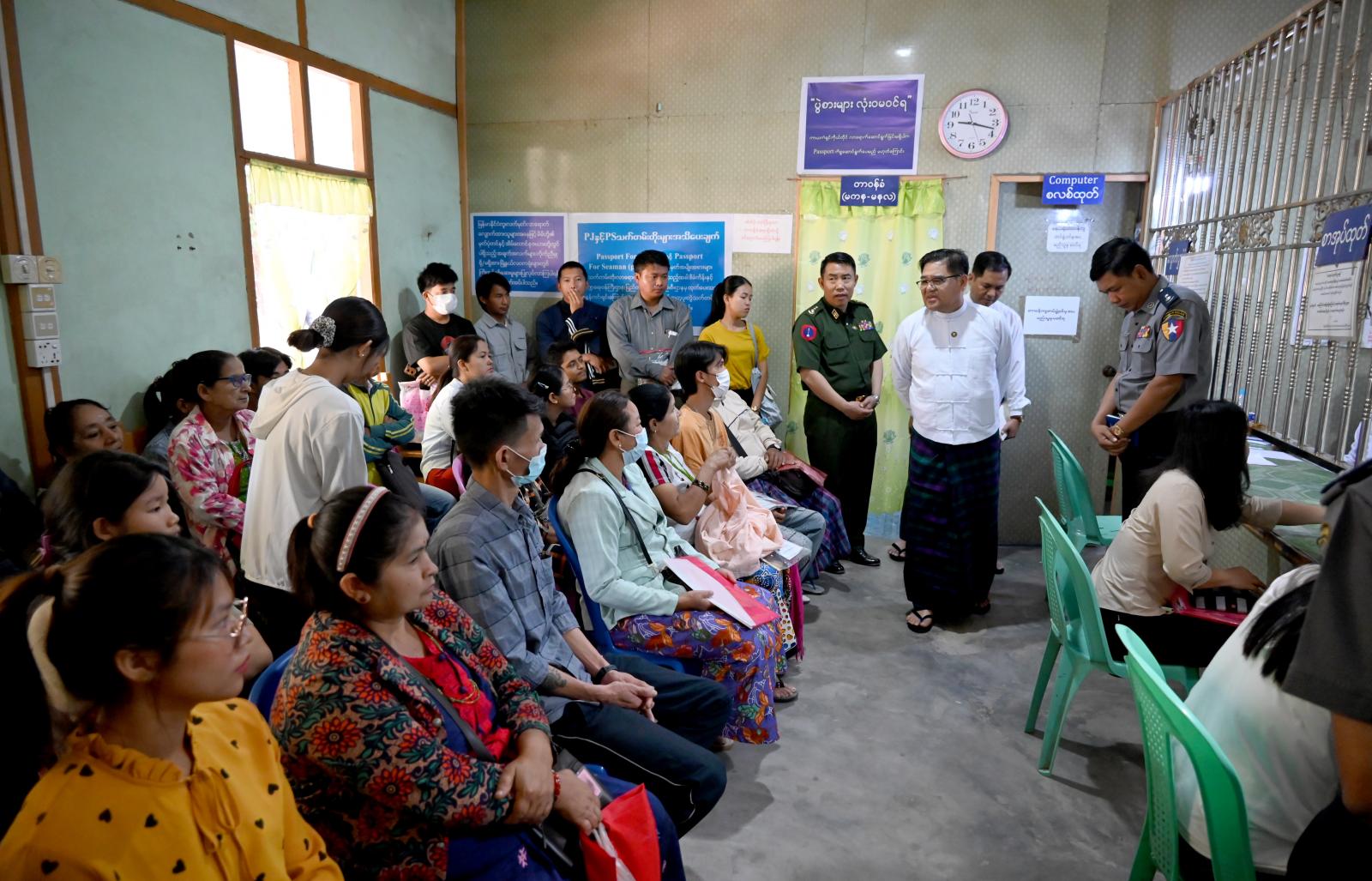 ထို့နောက်ပြည်နယ်ဝန်ကြီးချုပ်သည် ပြည်နယ်လုံခြုံရေးနှင့်နယ်စပ်ရေးရာဝန်ကြီး ဗိုလ်မှူးကြီး ကျော်သူရ၊ တာဝန်ရှိသူများနှင့်အတူ မြစ်ကြီးနားမြို့ သီတာရပ်ကွက်အတွင်းရှိ မြန်မာနိုင်ငံကူးလက် မှတ်ထုတ်ပေးရေးရုံးခွဲ(မြစ်ကြီးနား)သို့ သွားရောက်ပြီး ရုံးခွဲဝင်းအတွင်း နိုင်ငံကူးလက်မှတ်လာရောက် လျှောက်ထားသူများ၊ နိုင်ငံကူးလက်မှတ်သက်တမ်းတိုးသူများအား ရင်းရင်းနှီးနှီး လိုက်လံနှုတ်ဆက် ပြီး နိုင်ငံကူးလက်မှတ်အတွက် ဌာနဆိုင်ရာများ၏ဝန်ဆောင်မှုလုပ်ငန်းများဆောင်ရွက်ပေးနေမှုအခြေ အနေများကို လိုက်လံကြည့်ရှုစစ်ဆေးကာ ပြည်နယ်ဝန်ကြီးချုပ်က ပြည်သူများ နိုင်ငံကူးလက်မှတ် လာရောက်လျှောက်ထားရာတွင် လည်းကောင်း၊ ဝန်ဆောင်မှုလုပ်ငန်းများအတွက် စောင့်ဆိုင်းရာတွင် လည်းကောင်း သက်တောင့်သက်သာစွာ စောင့်ဆိုင်းနိုင်ရေးအတွက် တန်းလျားထိုင်ခုံများ ထပ်မံဝယ်ယူဖြည့်ဆည်းပေးနိုင်ရေး၊ ဈေးဆိုင်ငယ်များတွင် ထိုင်ခုံများ စနစ်တကျသန့်ရှင်းစွာ ရောင်းချနိုင်ရေး၊ သန့်ရှင်းရေးအတွက် ရေအိမ်တည်ဆောက်ပေးနိုင်ရေးနှင့် လိုအပ်သည်များကို ဌာနဆိုင်ရာ တာဝန်ရှိသူများနှင့် ညှိနှိုင်း ပေါင်းစပ်၍ ဖြည့်ဆည်းဆောင်ရွက်ပေးခဲ့သည်။