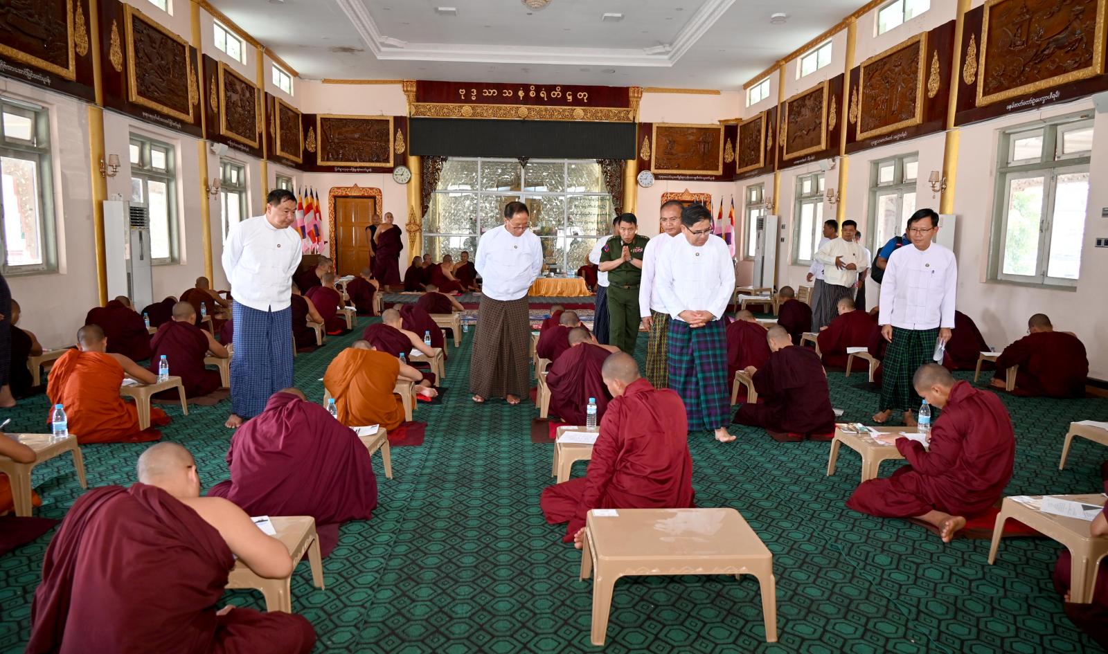 ဆက်လက်၍ ပြည်နယ်ဝန်ကြီးချုပ်နှင့် အဖွဲ့ဝင်များသည် အဆိုပါ သာသနာဗိမ္မာန်တော်ကြီး အတွင်း ဓမ္မာစရိယတန်း စာမေးပွဲဖြေဆိုနေသော သံဃာတော်များ၊ ပါဠိပထမပြန်စာမေးပွဲများဖြစ် သည့် ပထမကြီးတန်း၊ ပထမလတ်တန်း၊ ပထမငယ်တန်းနှင့် အခြေပြုမူလတန်း စာမေးပွဲများ ဖြေဆို နေကြသော သံဃာတော်များ၊ သီလရှင်များအား လှည့်လည်ကြည်ညိုခဲ့ကြသည်။