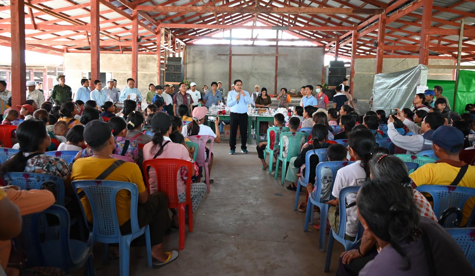 ထို့နောက် ပြည်နယ်ဝန်ကြီးချုပ်က ဘုရားကျောင်းဝင်းအတွင်းနှင့် ကျေးရွာအတွင်း ယာယီတိမ်းရှောင်နေထိုင်ကြသည့် အိမ်ထောင်စုများအား အားပေးစကားပြောကြားပြီး အိမ်ထောင်စုများ အတွက် ထောက်ပံ့ငွေကျပ် ၃ သိန်းနှင့် ကျန်းမာရေးစောင့်ရှောက်မှုလုပ်ငန်းစဉ်တွင် ပါဝင်သူများအား ထောက်ပံ့ချီးမြှင့်ငွေများကို ပေးအပ်ခဲ့ကာ စခန်းတာဝန်ရှိသူများက နေထိုင်စခန်းများအတွင်း လိုအပ်ချက်များကို တင်ပြကြရာ ပြည်နယ်ဝန်ကြီးချုပ်က လိုအပ်သည်များကို ဌာနဆိုင်ရာတာဝန်ရှိသူများနှင့် ပေါင်းစပ်ညှိနှိုင်းဆောင်ရွက်ပေးခဲ့သည်။