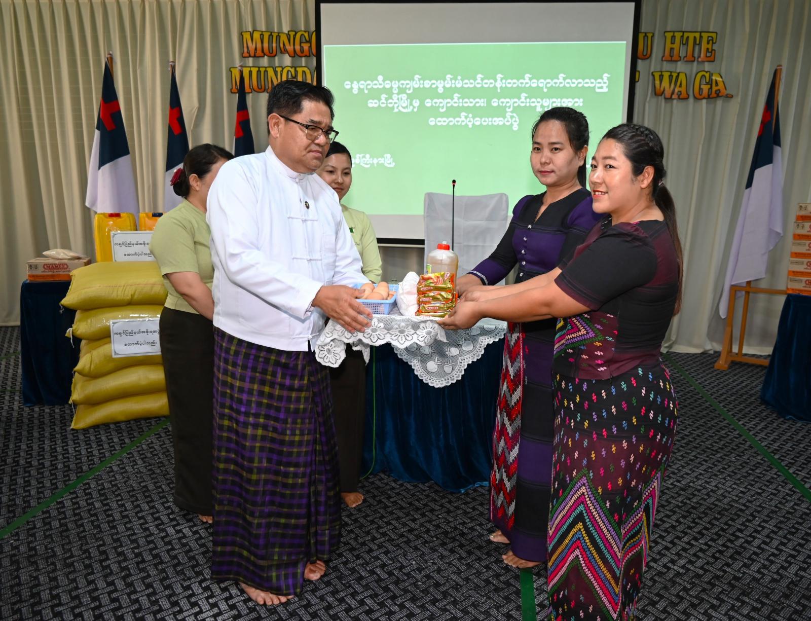 ဆက်လက်၍ ပြည်နယ်ဝန်ကြီးချုပ်နှင့် ပြည်နယ်တရားလွှတ်တော်တရားသူကြီးချုပ်တို့က (၁)လကြာ ဖွင့်လှစ်မည့် အဆိုပါ သင်တန်းမှ သင်တန်းဆရာ/ ဆရာမများအတွက် ငွေကျပ် (၃)သိန်းနှင့် သင်တန်းသား/ သင်တန်းသူ (၆၆)ဦးတို့အတွက် ငွေကျပ် ၂၄၀၀၀၀၀ တန်ဖိုးရှိ ဆန်အိတ် (၂၀)အိတ်၊ ခေါက်ဆွဲခြောက် ဖာ (၂၀)၊ ကြက်ဥ (၂၀)ကတ်၊ ဆီပိဿာ (၂၀)ကို အသီးသီးထောက်ပံ့ပေးအပ်ခဲ့ကြပြီး သင်တန်းသား/သင်တန်းသူများ၏ လိုအပ်ချက်များကို ဆွေးနွေးတင်ပြကြရာ ပြည်နယ်ဝန်ကြီးချုပ်က လိုအပ်ချက်များအပေါ် ဌာနဆိုင်ရာတာဝန်ရှိသူများနှင့် ညှိနှိုင်းပေါင်းစပ်ဆောင်ရွက်ပေးခဲ့ကာ သိက္ခာ တော်ရဆရာ၏ ကောင်းချီးတောင်းခံဆုတောင်းဆက်ကပ်ပေးမှုကို ခံယူခဲ့ကြသည်။