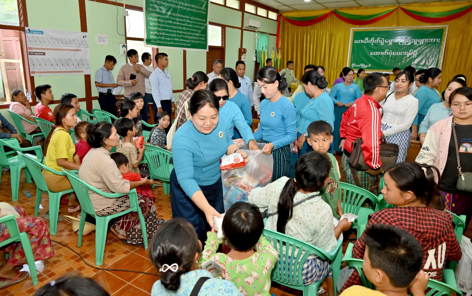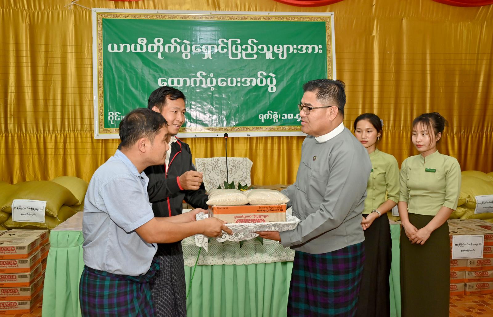 ထို့နောက် ပြည်နယ်ဝန်ကြီးချုပ်နှင့် တာဝန်ရှိသူများက ဝိုင်းမော်မြို့နယ် ဝူယန်ကျေးရွာအုပ်စု၊ စန်းကား၊ နောင်ဟီးကျေးရွာတို့မှ အမှတ်(၃)ရပ်ကွက် ယူကလစ်ကုန်း၊ လော်ဝေါ်စာပေနှင့် ယဉ်ကျေး မှုကော်မတီရုံးတို့တွင် ယာယီတိမ်းရှောင်နေထိုင်လျက်ရှိသည့် အိမ်ထောင်စု (၉၃)စုနှင့် နောင်ချိန်း ကျေးရွာ KBC Camp တို့တွင် ယာယီနေထိုင်လျက်ရှိသည့် အိမ်ထောင်စုများအတွက် ထောက်ပံ့ငွေ ကျပ်စုစုပေါင်း (၁၁၉၇၄၅၀၀)တန်ဖိုး ရှိ ဆန်အိတ်(၁၂၄)အိတ်၊ ခေါက်ဆွဲခြောက်ဖာ (၁၉၃)ဖာတို့ကို လည်းကောင်း၊ ပြည်နယ်ဝန်ကြီးချုပ်၏ဇနီးက အခမ်းအနား တက်ရောက်လာကြသည့် ယာယီတိမ်းရှောင်ပြည်သူများအတွက် မုန့်များကိုလည်းကောင်း အသီးသီးထောက်ပံ့ပေးအပ်ခဲ့ကြသည်။