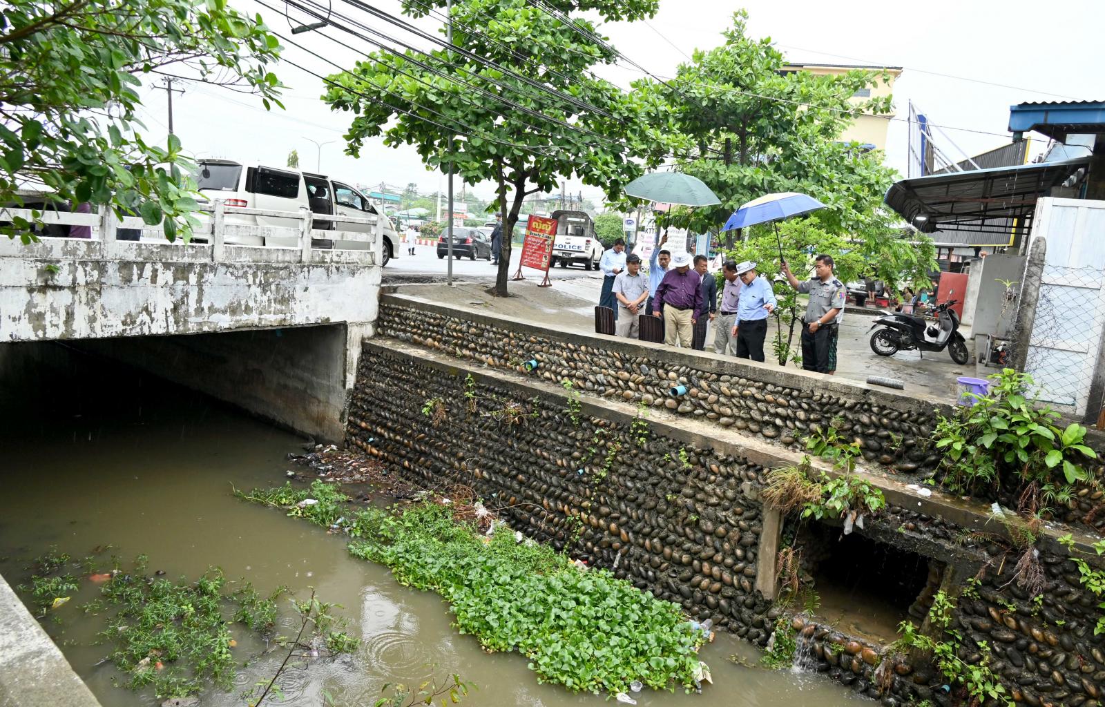 ထို့နောက် မြို့သစ်ကြီးရပ်ကွက်အတွင်း ဈေးကြီးလမ်းတစ်လျှောက် လမ်းဘေးဝဲ/ယာရှိ ရေ နုတ်မြောင်းများ ရေစီးရေလာကောင်းမွန်ရေး စည်ပင်သာယာရေးအဖွဲ့ဝန်ထမ်းများ၏ ရေနုတ်မြောင်း ရှင်းလင်းရေးဆောင်ရွက်နေမှုကို ကြည့်ရှုစစ်ဆေးခဲ့ကြပြီး မြို့သစ်ကြီးရပ်ကွက် ပြည်ထောင်စုလမ်းမကြီးနှင့် မဟာဗန္တုလလမ်းဆုံနေရာတွင် လည်းကောင်း၊ Northen Star ဂေါက်ကွင်းသွားလမ်းမှလည်းကောင်း မြို့သစ်ကြီးမြောင်းမကြီးအား လှည့်လည်ကြည့်ရှုစစ်ဆေးကာ ပြည်နယ်ဝန်ကြီးချုပ်က မြောင်းမကြီး ရှင်းလင်းရေးလုပ်ငန်းများကို မိုးမကျမီ ဆောလျင်စွာ ရေစီးရေလာကောင်းမွန်အောင် ဆောင်ရွက်နိုင်ရေးနှင့် မြောင်းမကြီးတစ်လျှောက် လူနေအိမ်ခြံဝင်းများ ကျူးကျော်ဆောက်လုပ်မှုမရှိစေရေးနှင့် ဖယ်ရှားရှင်းလင်းနိုင်ရေး ဌာနဆိုင်ရာတာဝန်ရှိသူများနှင့် ပေါင်းစပ်ညှိနှိုင်းဆောင်ရွက်ပေး ခဲ့သည်။