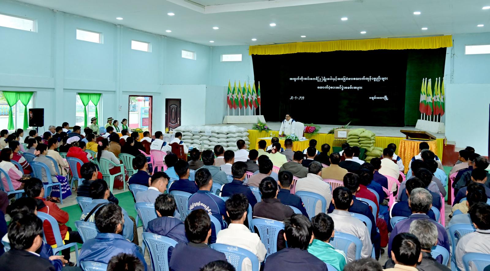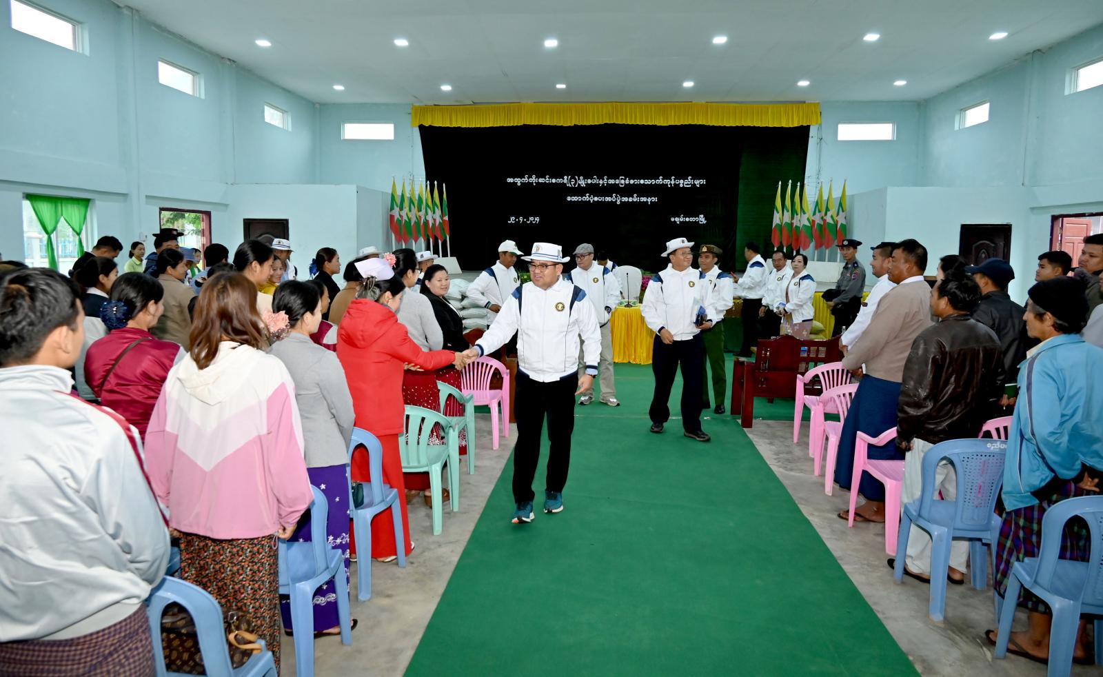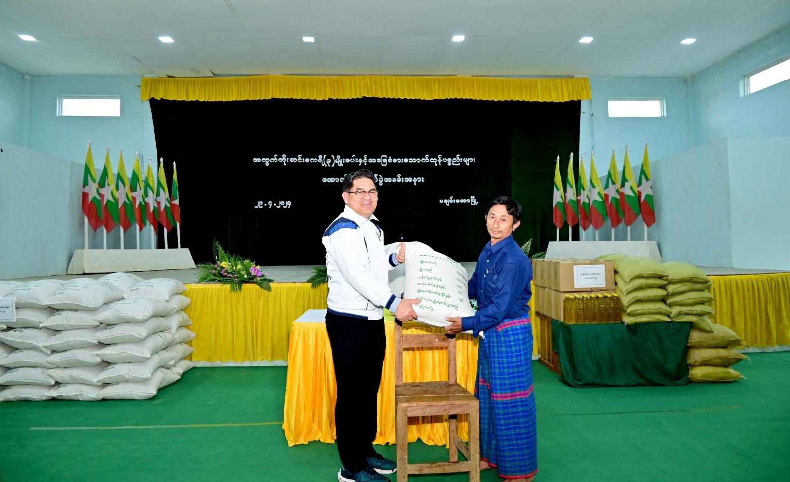 ထို့နောက် ပြည်နယ်ဝန်ကြီးချုပ်က မြို့နယ်အတွင်းရှိ ဌာနဆိုင်ရာအဖွဲ့အစည်းအားလုံးအတွက် ကုလားပဲ (၂၁၇) ပိဿာ၊ စားသုံးဆီ (၁၀၈) ပိဿာနှင့် ငါးခြောက် (၇၃) ပိဿာ၊ ကြက်ဥနှင့် ခေါက်ဆွဲ ခြောက်ဖာများကို လည်းကောင်း၊ ဒေသခံတောင်သူများအတွက် အထူးအထွက်တိုး ဆင်းဧကရီ-၃ မျိုးစပါးတင်း (၁၅၀၀) တို့အား လည်းကောင်း ထောက်ပံ့ပေးအပ်ခဲ့ကာ နိဂုံးချုပ် အမှာစကားပြော ကြားခဲ့သည်။