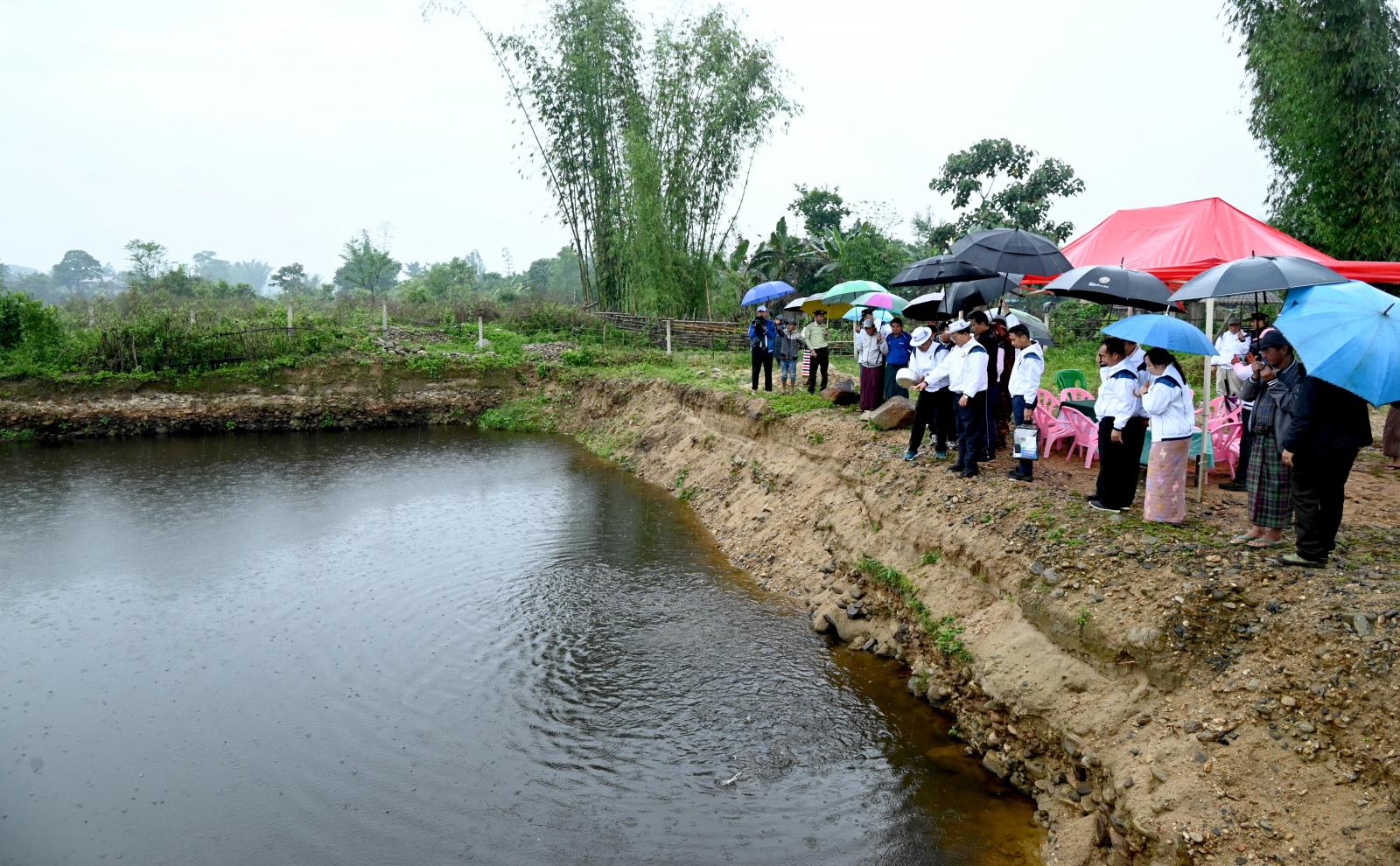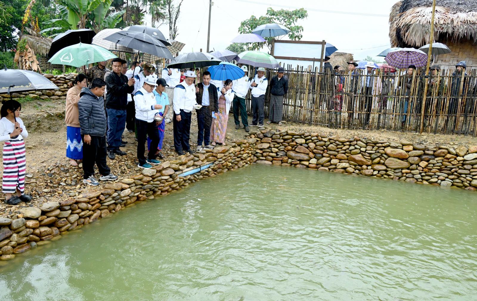 ယင်းနောက် နမ်ခမ်းကျေးရွာသို့ သွားရောက်ပြီး ကျေးရွာအတွင်း မွေးမြူရေးတောင်သူများ၏ နိုင်ငံ့စီးပွားမြှင့်တင်ရေး ရန်ပုံငွေဖြင့် ငါးမွေးမြူရေးကန် (၂)ကန်ဖြင့် ငါးများမွေးမြူထားရှိမှုကို လည်း ကောင်း၊ တောင်သူဒေါ်ချန်နန်ဆား၏ ခြံအပါအဝင် ကျေးရွာအတွင်း တောင်သူ (၈၁) ဦး အစုအဖွဲ့ဖြင့် နိုင်ငံ့စီးပွားမြှင့်တင်ရေးရန်ပုံငွေဖြင့် ထူထောင်ပေးခဲ့သော နမ်ခမ်းမွေးမြူရေး သမဝါယမအသင်းလီမိ တက်ပိုင် ငါးမွေးမြူရေးကန်များတွင်း ငါးသားပေါက်များ မွေးမြူထားရှိမှု အခြေအနေများကို လည်း ကောင်း လှည့်လည်ကြည့်ရှုစစ်ဆေးခဲ့ကြပြီး ငါးများမွေးမြူရောင်းချနိုင်မှု အခြေအနေ၊ စီးပွားဖြစ်ထွန်း မှုအခြေအနေများနှင့်စပ်လျဉ်း၍ ငါးမွေးတောင်သူများနှင့် ရင်းရင်းနှီးနှီးဆွေးနွေးခဲ့ကြကာ ပြည်နယ် ဝန်ကြီးချုပ်က နမ်ခမ်းကျေးရွာတွင် နိုင်ငံ့စီးပွားမြှင့်တင်ရေး ရန်ပုံငွေဖြင့် လက်ရှိငါးမွေးမြူရေးကန် ပေါင်း (၃၀) ဖြင့် စီးပွားဖြစ်မွေးမြူလျက်ရှိသည့်အတွက် ဆက်လက်၍ ငါးမွေးမြူရေးစံပြကျေးရွာ တစ်ခုအဖြစ် အကောင်အထည်ဖော်နိုင်ရေး နိုင်ငံ့စီးပွားမြှင့်တင်ရေးရန်ပုံငွေ ဒုတိယနှစ်စက်ဝန်းဖြင့် ထပ်မံတိုးချဲ့မတည်ပေးနိုင်ရေး ငါးဦးစီးဌာန တာဝန်ရှိသူများနှင့် ဒေသခံပြည်သူများအကြား လိုအပ် သည်များကို ညှိနှိုင်းပေါင်းစပ်ဆောင်ရွက်ပေးခဲ့သည်။