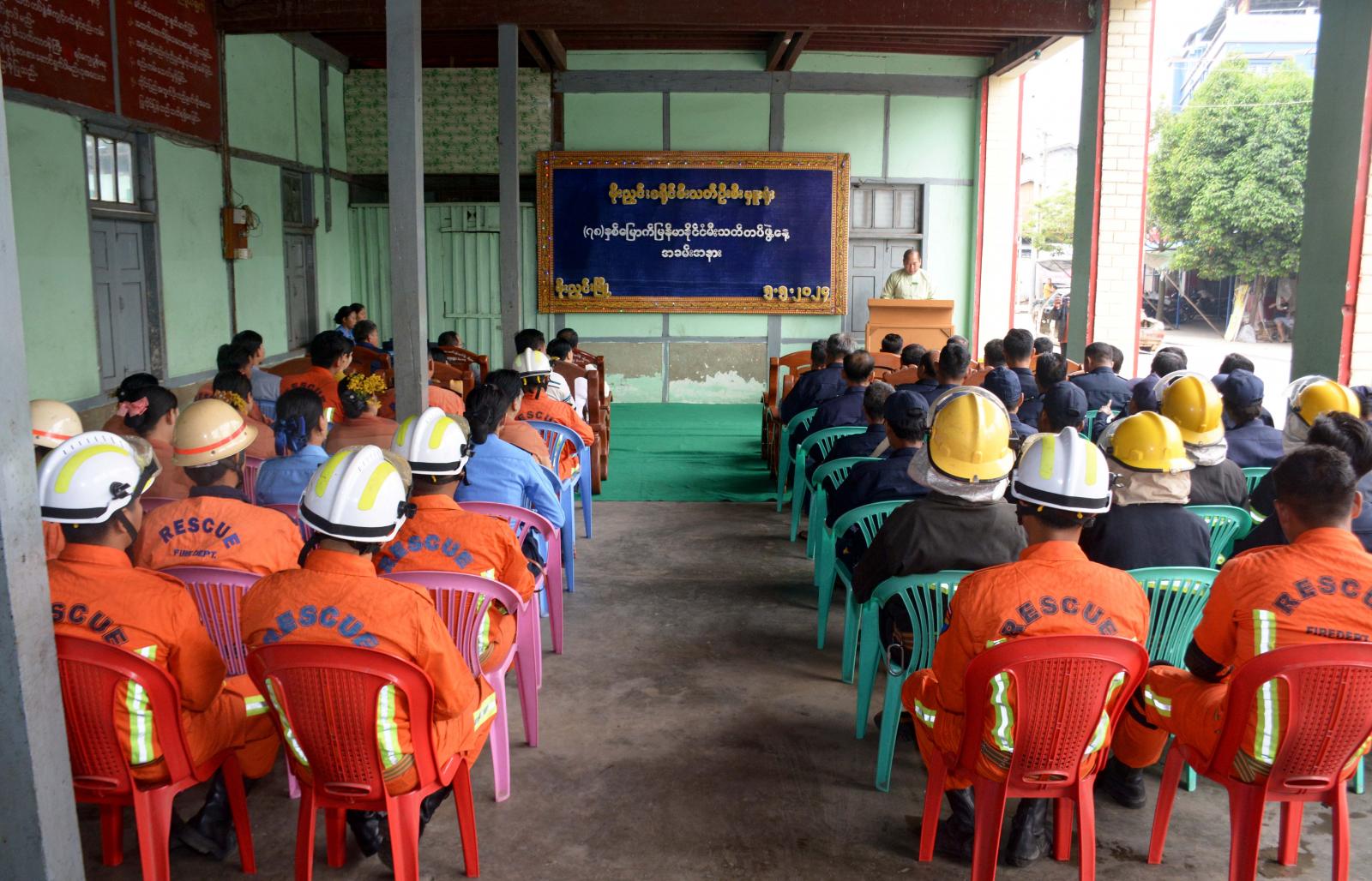 ဦးစွာ အခမ်းအနားတွင် ခရိုင်စီမံအုပ်ချုပ်ရေးအဖွဲ့ဥက္ကဋ္ဌ ဦးညီညီလွင်က မြန်မာနိုင်ငံမီးသတ်တပ်ဖွဲ့အနေဖြင့် ပြည်သူလူထုအတွင်း မီးဘေးလုံခြုံရေး၊ သဘာဝဘေးအန္တရာယ် ကာကွယ်ရေး၊ ရှာဖွေကယ်ဆယ်ရေး၊ ပြည်သူ့အကျိုးပြုဆောင်ရွက်ရေးစသည့် ရှည်မှန်းချက် တာဝန်များကို ဦးလည်မသုန် တာဝန်ထမ်းဆောင်ခဲ့ကြသည့် ရှေးမီးသတ်သမားကြီးများ၏ မျက်မှောက်ခေတ် ပြည်သူ့ဝန်ဆောင်မှုလုပ်ငန်းဖြစ်သော မီးသတ်လုပ်ငန်းဆိုင်ရာများကို စွမ်းအားပြည့်တာဝန်ထမ်းဆောင်နေကြသော မီးသတ်တပ်ဖွဲ့ဝင်များအားလုံးကို ဂုဏ်ပြုအပ်ပါကြောင်း ပြောကြားသည်။