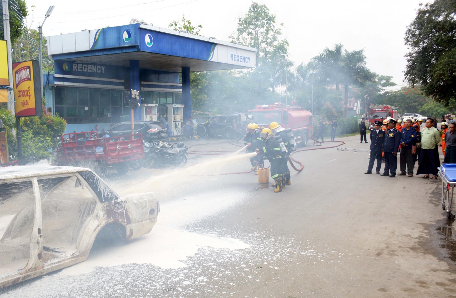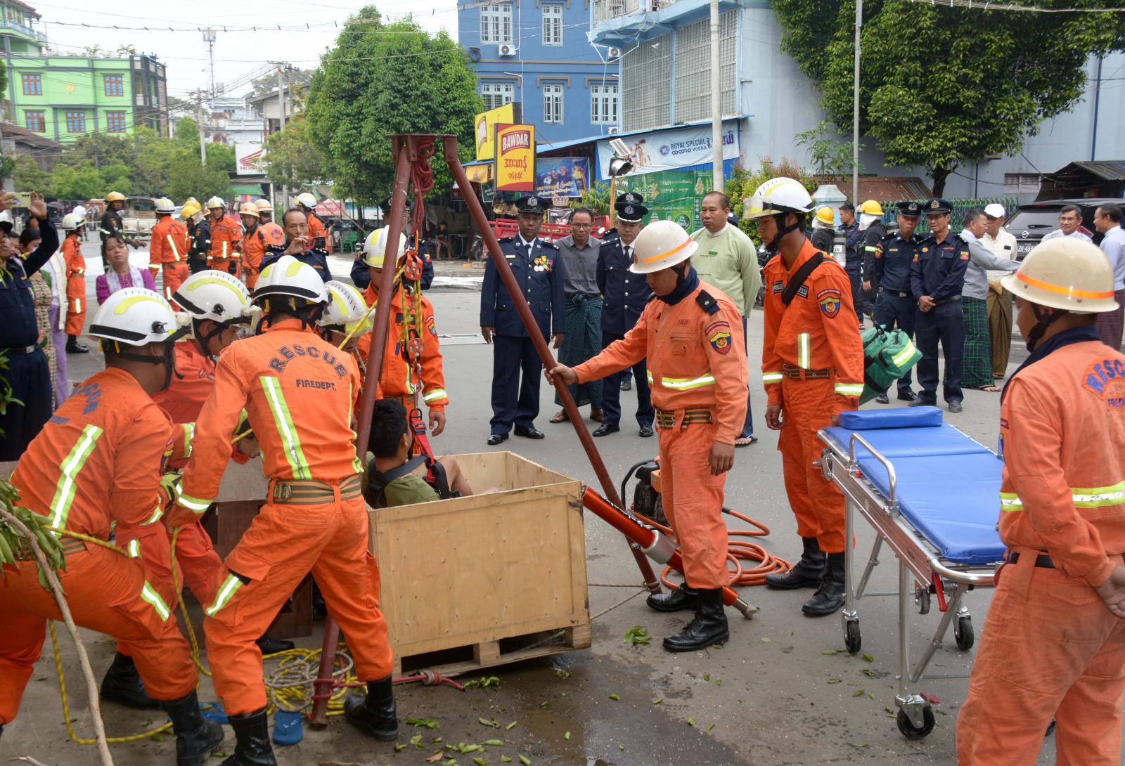 ထို့နောက် မော်တော်ကားမီးလောင်မှုအား မီးငြိမ်းသတ်ရေးဆောင်ရွက်ခြင်း၊ အထပ်မြင့် နေအိမ်အဆောက်အဦပေါ်မှ လူနာကယ်ဆယ်ခြင်း၊ ပိတ်မိနေသည့် အဆောက်အဦအတွင်း လူနာကယ်ဆယ်ခြင်းလုပ်ငန်များနှင့် လူနာတင်ယာဉ်ဖြင့်သယ်ဆောင်ခြင်း သဏ္ဍာန်တူ သရုပ်ပြသခြင်းများကို ဆက်လက်ဆောင်ရွက်ရာ တက်ရောက်လာကြသူများက စိတ်ပါဝင်စားစွာ အားတက်သရော ကြည့်ရှုအားပေးခဲ့ကြကြောင်း သိရသည်။