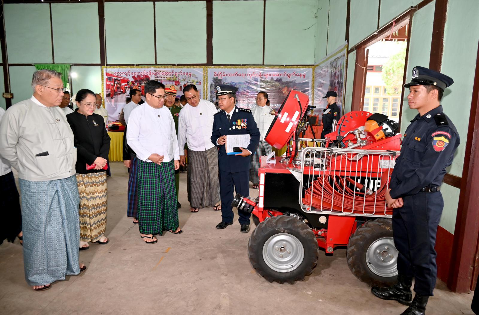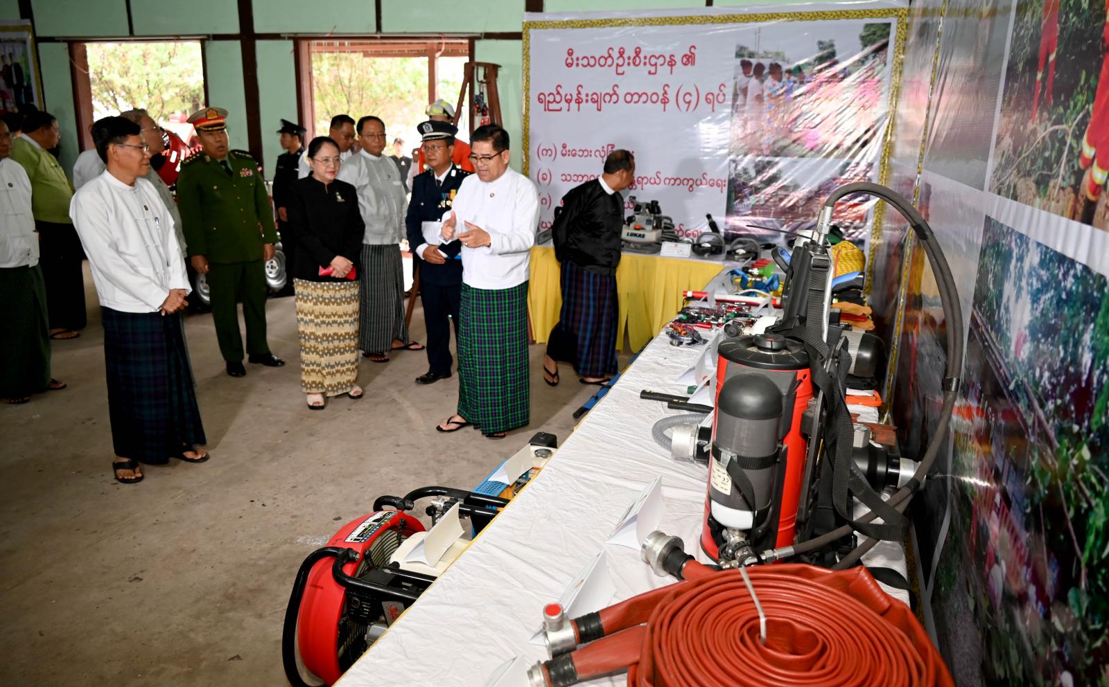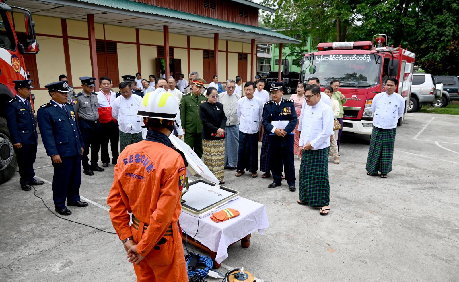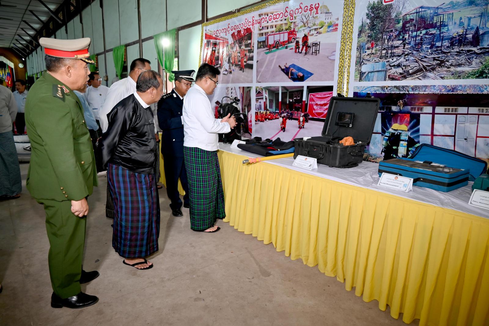 ဆက်လက်၍ ခန်းမအတွင်းနှင့် ခန်းမအပြင်ဘက်တို့တွင် ခင်းကျင်းပြသထားသော ခေတ်မီ မီးငြိမ်းသတ်ရေးနှင့် ရှာဖွေကယ်ဆယ်ရေးပစ္စည်းများ၊ အသုံးအဆောင်များနှင့် ရှာဖွေကယ်ဆယ်ယာဉ် များအား လှည့်လည်ကြည့်ရှုစစ်ဆေးခဲ့ကြကြောင်း သိရသည်။