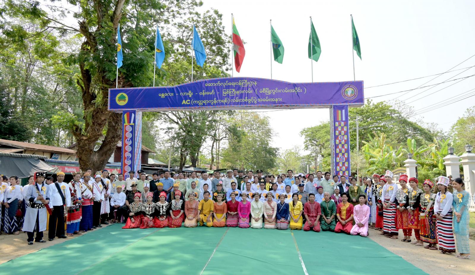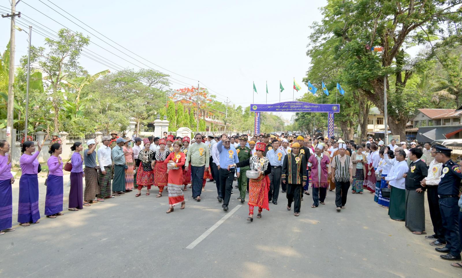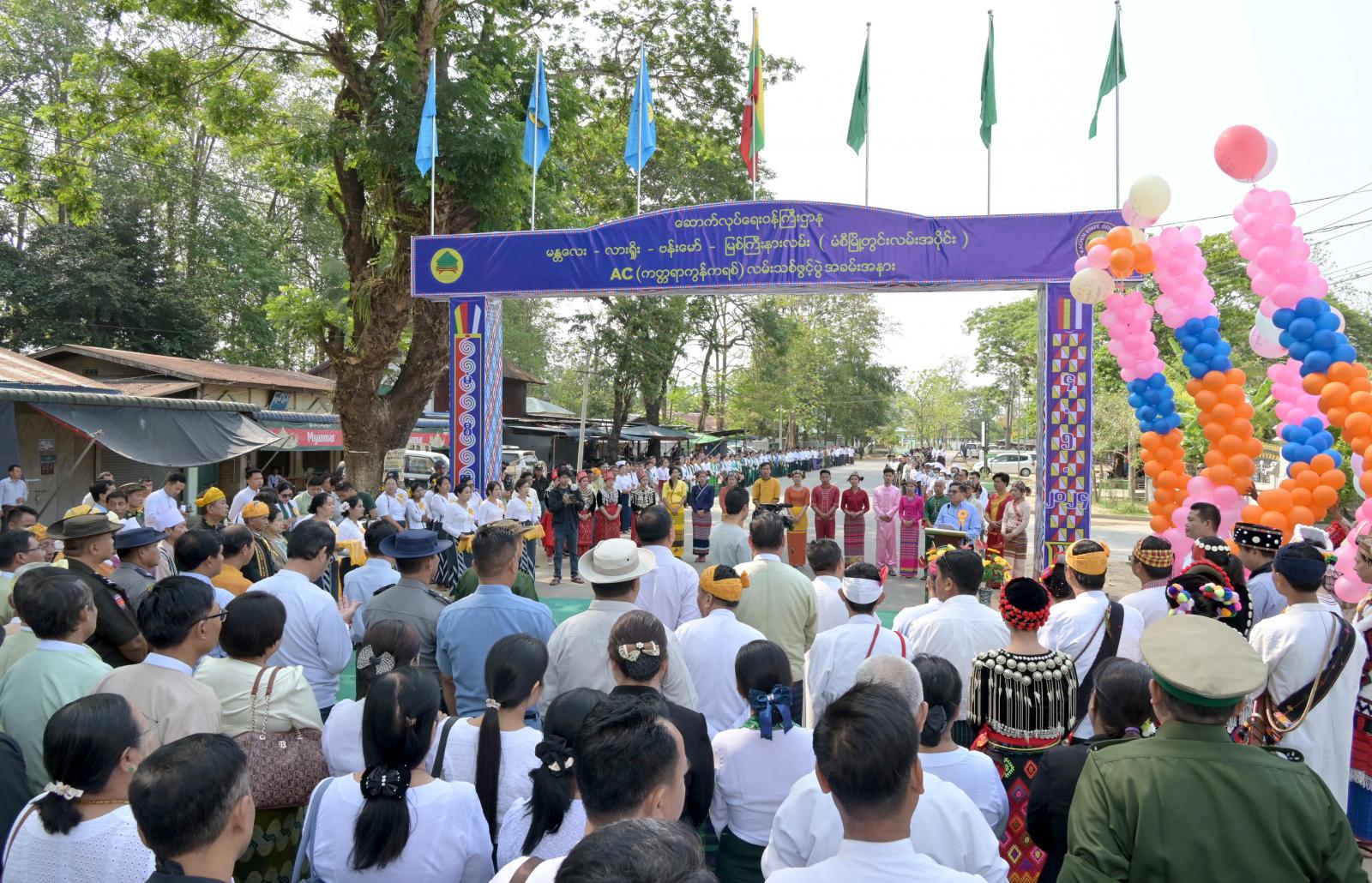 ထို့နောက် လမ်းသစ်အား ပြည်နယ်ဝန်ကြီးချုပ်၊ ပြည်နယ်လူမှုရေးရာဝန်ကြီး၊ ပြည်နယ်တိုင်း ရင်းသားရေးရာဝန်ကြီး၊ အမှတ်(၂၁)စစ်ဆင်ရေးကွပ်ကဲရေးမှူးနှင့် ခရိုင်စီမံအုပ်ချုပ်ရေးအဖွဲ့ ဥက္ကဋ္ဌ တို့က ဖဲကြိုးဖြတ်ဖွင့်လှစ်ပေးကြပြီး ပြည်နယ်ဝန်ကြီးချုပ်က တိုင်းရင်းသားရိုးရာယဉ်ကျေးမှုအဖွဲ့များ အတွက် ဂုဏ်ပြုချီးမြှင့်ငွေများ ပေးအပ်ကာ လမ်းဖွင့်ပွဲတက်ရောက်လာကြသည့် အဖွဲ့အစည်းအသီး သီးတို့နှင့် အမှတ်တရ မှတ်တမ်းတင်ဓာတ်ပုံရိုက်ကူးခဲ့ကြပြီး လမ်းသစ်အား ဖြတ်သန်းကြည့်ရှု စစ်ဆေးခဲ့ကြသည်။
