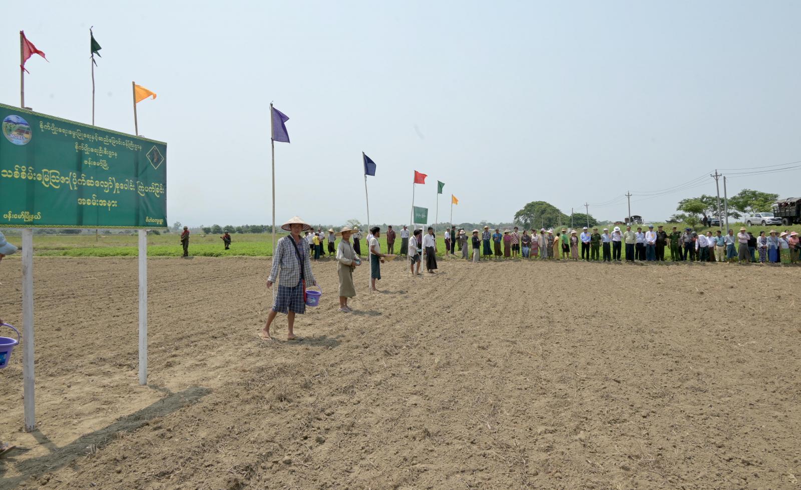 ဆက်လက်၍ ကွင်းအတွင်း လယ်မြေများပေါ်တွင် တောင်သူများနှင့် စိုက်ပျိုးရေးဝန်ထမ်းများ ၏ တောင်သူအသိပညာပေး သစ်စိမ်းမြေသြဇာ (ပိုက်ဆံလျှော်) မျိုးစေ့များ စုပေါင်းကြဲပက်မှုကို ကြည့်ရှုအားပေးခဲ့ကြပြီး နိုင်ငံ့စီးပွားမြှင့်တင်ရေး ရန်ပုံငွေဖြင့် လယ်သီးထပ်ဆောင်းသီးနှံ မြေပဲစိုက်ပျိုး ထားရှိမှုကို ကြည့်ရှုစစ်ဆေးခဲ့ကြသည်။