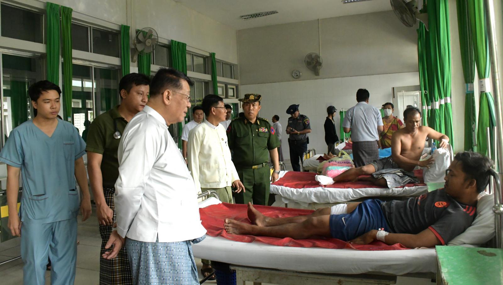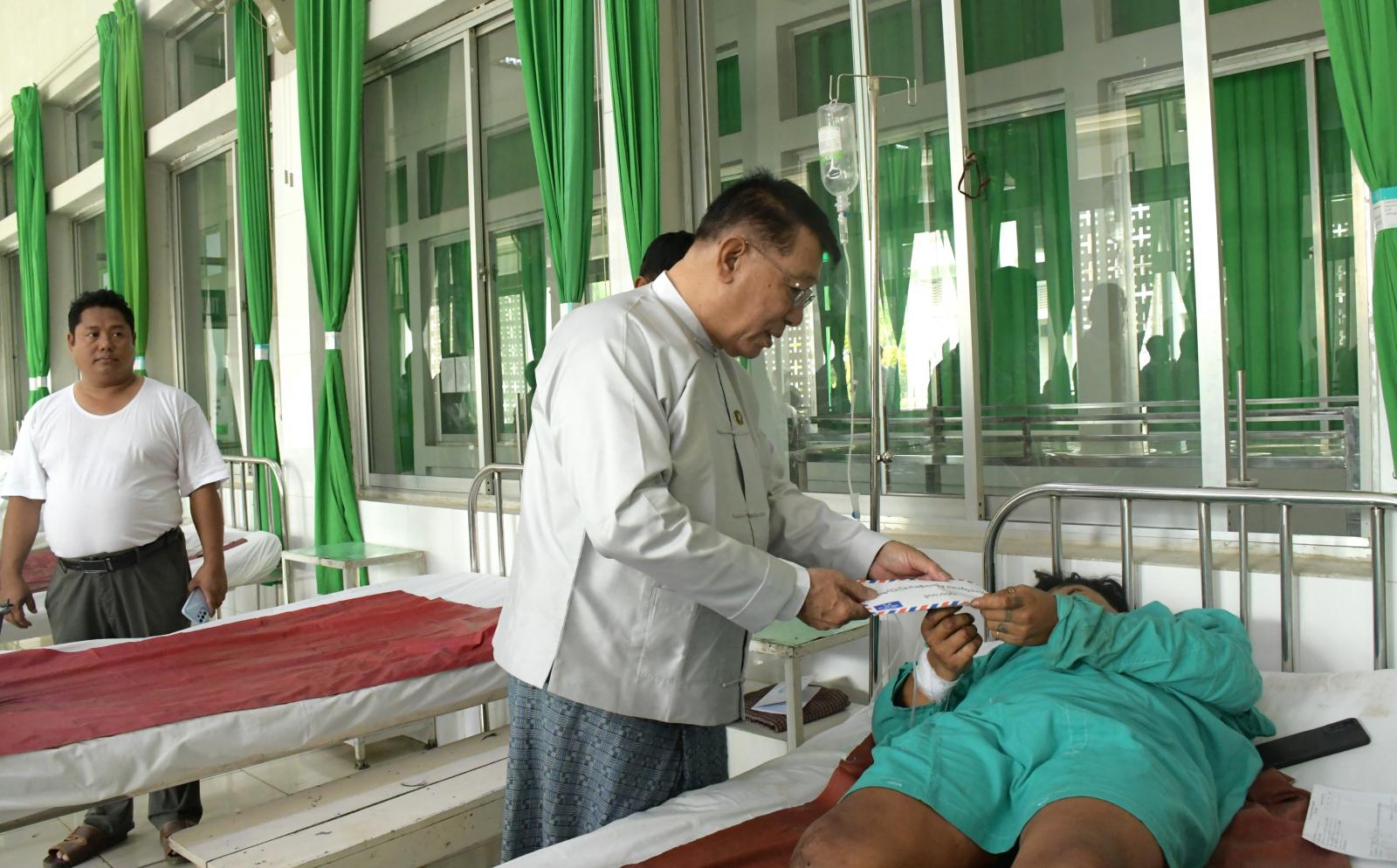 ထို့နောက် ကချင်ပြည်နယ်အစိုးရအဖွဲ့ဝင် ဝန်ကြီးများသည် တာဝန်ရှိသူများနှင့်အတူ မြစ်ကြီးနားမြို့ မြောက်ပိုင်းတိုင်းစစ်ဌာနချုပ် ခုတင်(၃၀၀)ဆံ့ အမှတ်(၁) တပ်မတော်ဆေးရုံသို့ သွားရောက်၍ ယနေ့ နံနက်ပိုင်းတွင် အကြမ်းဖက်အဖွဲ့အစည်းများက ပစ်ခတ်တိုက်ခိုက်မှုကြောင့် မြစ်ကြီးနားမြို့၊ ပမ္မတီး ရပ်ကွက်သို့ လက်နက်ကြီး ကျရောက်မှုဖြစ်စဉ်ကြောင့် ထိမှန်ဒဏ်ရာရရှိသည့် ပြည်သူများနှင့် သေဆုံးသူ၏ မိသားစုဝင်များအား သွားရောက်တွေ့ဆုံအားပေးကာ လိုအပ်ချက်များ ဖြည့်ဆည်းပေးပြီး ထောက်ပံ့ငွေကျပ် (၅၄၀၀၀၀၀)ကို ပေးအပ်ခဲ့ကြောင်း သိရသည်။