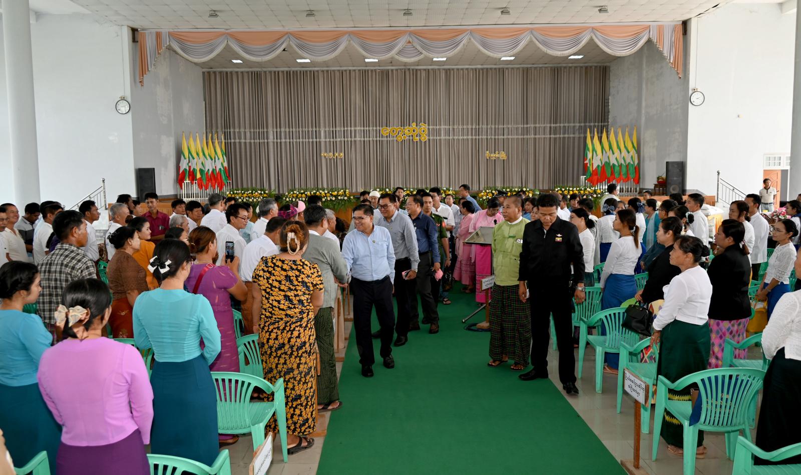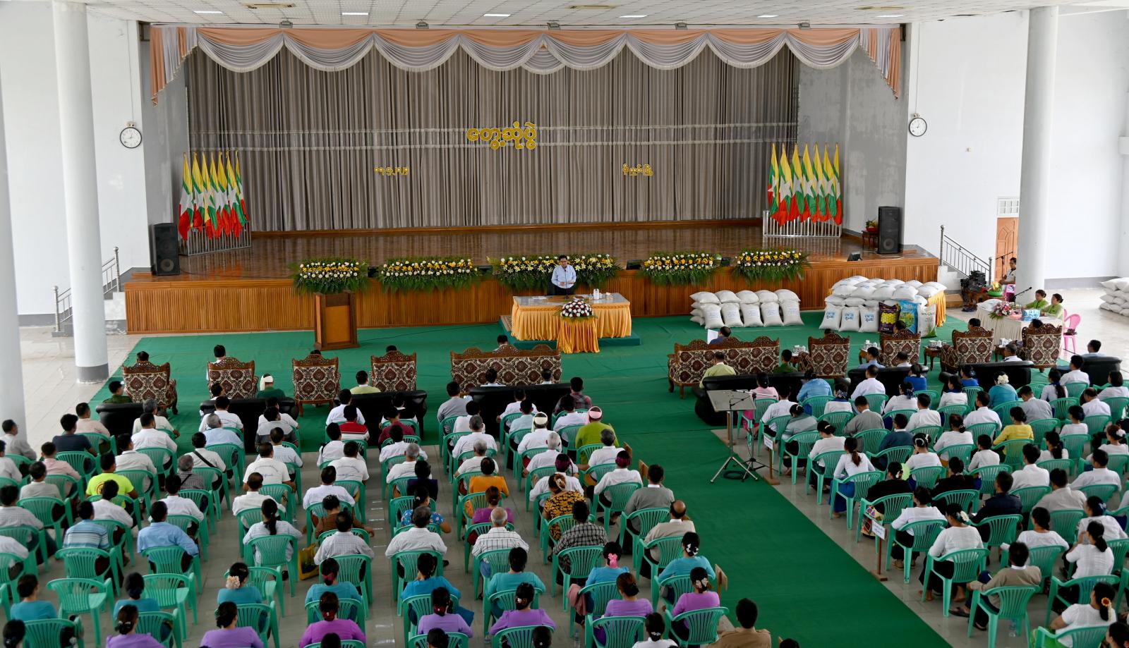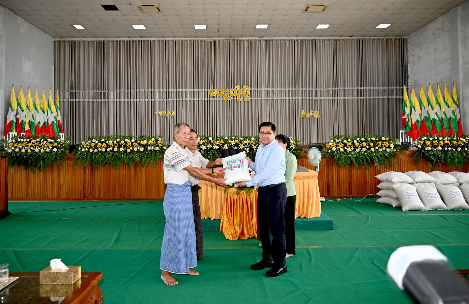 ဆက်လက်၍ ပြည်နယ်ဝန်ကြီးချုပ်နှင့် တာဝန်ရှိသူများက ပြည်နယ်အစိုးရအဖွဲ့က ခရိုင်အတွင်းရှိ စိုက်ပျိုးရေးသမဝါယမတောင်သူများအတွက် ထောက်ပံ့သည့် GW-11 အထွက်တိုးစပါး မျိုးစေ့အိတ် (၁၅၀)၊ မွေးမြူရေးတောင်သူများအတွက် မွေးမြူရေးအထောက်အကူပြုဆေးဝါးပစ္စည်းများ၊ ဘာသာရေးအသင်းအဖွဲ့ (၁၀)ဖွဲ့အတွက် ဆန် (၁၀)အိတ်စီဖြင့် ဆန်အိတ် (၁၀၀)နှင့် ကချင်၊ ရှမ်းနှင့်ရခိုင်တိုင်းရင်းသား စာပေနှင့်ယဉ်ကျေးမှုအသင်းအဖွဲ့များအတွက် ဆန်အိတ် (၁၀)အိတ်စီဖြင့် စုစုပေါင်း ဆန်အိတ် (၃၀)အိတ်တို့ကို အသီးသီးထောက်ပံ့ပေးအပ်ခဲ့ကြကာ ပြည်နယ်ဝန်ကြီးချုပ်က နိဂုံးချုပ် အမှာစကားပြောကြားခဲ့သည်။