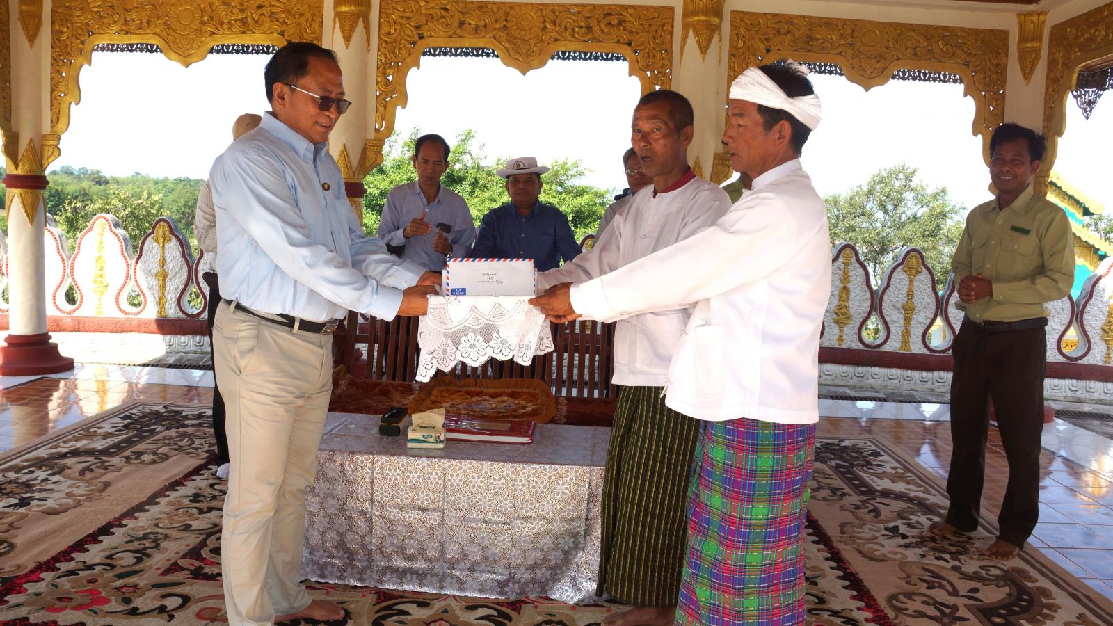 ရှေးဦးစွာ ပြည်နယ်ဝန်ကြီးနှင့် အဖွဲ့ဝင်များသည် မချမ်းဘောမြို့နယ်အတွင်းရှိ ရှေးဟောင်းသမိုင်းဝင် ကောင်းမှုလုံစေတီတော်ကြီးသို့ သွားရောက်ပြီး လက်ယာရစ်ပတ်ဖူးမြော်ကြည်ညိုကာ စေတီတော်မြတ်ကြီး ဘက်စုံမွမ်းမံပြုပြင်နိုင်ရေးအတွက် နာဝကာမအလှူငွေများကို ဂေါပကအဖွဲ့ဝင်များထံ ပေးအပ်လှူဒါန်းခဲ့သည်။