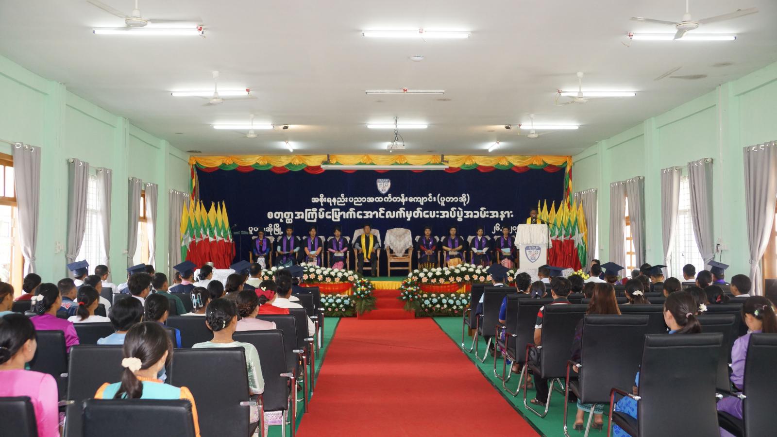 အဆိုပါ အောင်လက်မှတ်ပေးအပ်ပွဲတွင် ပြည်နယ်သယံဇာတရေးရာဝန်ကြီး ဦးတိန့်ဆောင်က နိုင်ငံခေတ်မီဖွံ့ဖြိုးတိုးတက်ရေးအတွက် သက်ဆိုင်ရာနယ်ပယ်အလိုက် ကျွမ်းကျင်တတ်မြောက်မှု၊ အသိပညာကြွယ်ဝမှု၊ ခံယူချက်ကောင်းမွန်မှုစသည့် အချက်များဖြင့် အရည်အသွေးပြည့်ဝသည့် လူသားကောင်း အရင်းအမြစ်များရှိရန် လိုအပ်ပါကြောင်း၊ သို့ဖြစ်ပါ၍ ယနေ့မောင်မယ်များအနေဖြင့် မိမိတို့တတ်မြောက်ထားသော သက်မွေးပညာဘာသာရပ်များကို အသုံးချပြီး လူမှုနယ်ပယ်အသီးသီးရှိ ဖွံ့ဖြိုးရေးကဏ္ဍများတွင် ဝိုင်းဝန်းကြိုးစားပါဝင်သွားကြရန် လိုအပ်ကြောင်း တိုက်တွန်းမှာကြားသည်။