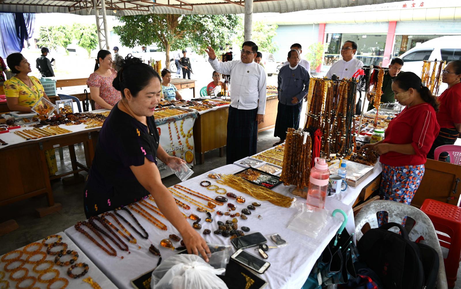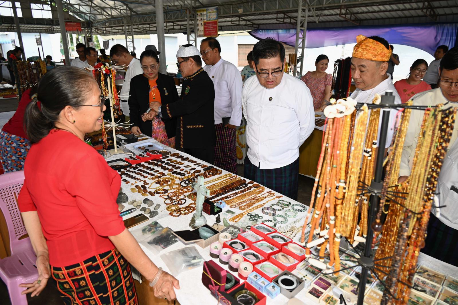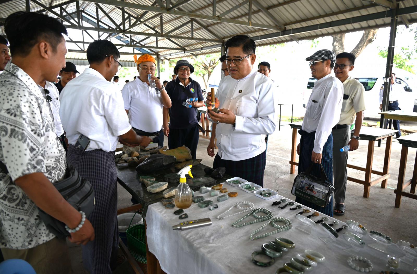 အလားတူ အသင်းပိုင်ဝင်းအတွင်းရှိ ကျောက်စိမ်းကျောက်မျက်ဈေးတန်းရုံများ၌ ဒေသထွက် ကျောက်စိမ်းများဝယ်ယူရောင်းချ၊ သွေးဖြတ်မှုလုပ်ငန်းများ ဆောင်ရွက်နေမှုများကို လှည့်လည်ကြည့်ရှုစစ်ဆေးခဲ့ကြပြီး ပြည်နယ်ဝန်ကြီးချုပ် လတ်တလောအခြေအနေအရ အရောင်းအဝယ်အနည်းငယ် အေးနေမှုဖြစ်သော်လည်း စိတ်အားငယ်မှုမရှိဘဲ ကြိုးစားရောင်းဝယ်ကြရေး၊ နယ်မြေတည်ငြိမ်ပြီး ငြိမ်းချမ်းပါက အရောင်းအဝယ်ဖြစ်ထွန်းကားလာစေရေး မိမိတို့အနေဖြင့် အတူတကွဝိုင်းဝန်ကြိုးစား ဆောင်ရွက်ကြရန် လိုကြောင်းတိုက်တွန်းပြောကြားခဲ့သည်။