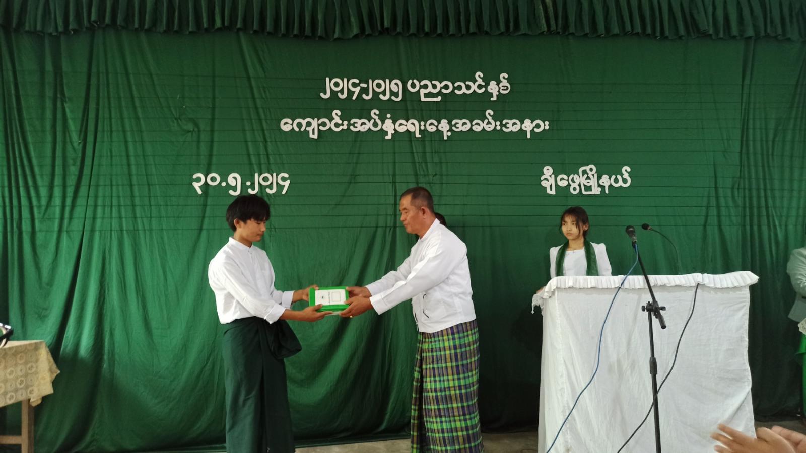 ယင်းနောက် ချီဖွေခရိုင်စီမံအုပ်ချုပ်ရေးအဖွဲ့ဥက္ကဋ္ဌ ဦးသက်နိုင်၊ ခရိုင်ပညာရေးမှူး ဦးမွန်ကျော်မြင့်နှင့် မြို့နယ်စီမံအုပ်ချုပ်ရေးအဖွဲ့ဥက္ကဌဦးချစ်စမ်းအောင်တို့က ပညာရေဝန်ကြီးဌာနမှ အခမဲ့ဖြန့်ဝေသော ကျောင်းသုံးပုံနှိပ်၊ ကျောင်းသုံးဝတ်စုံနှင့် ဗလာစာအုပ်များအား ကျောင်းသားကျောင်းသူများထံသို့ ပေးအပ်ခဲ့သည်။