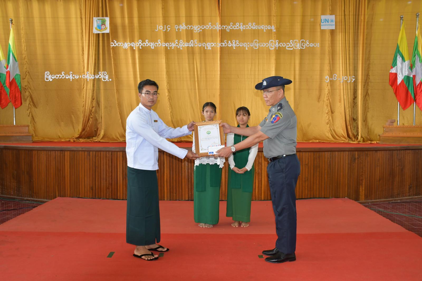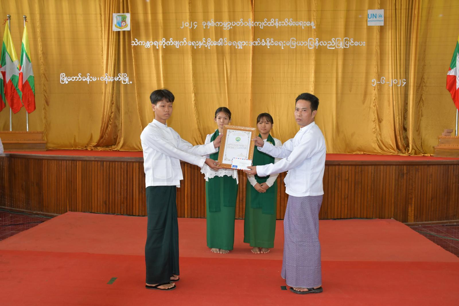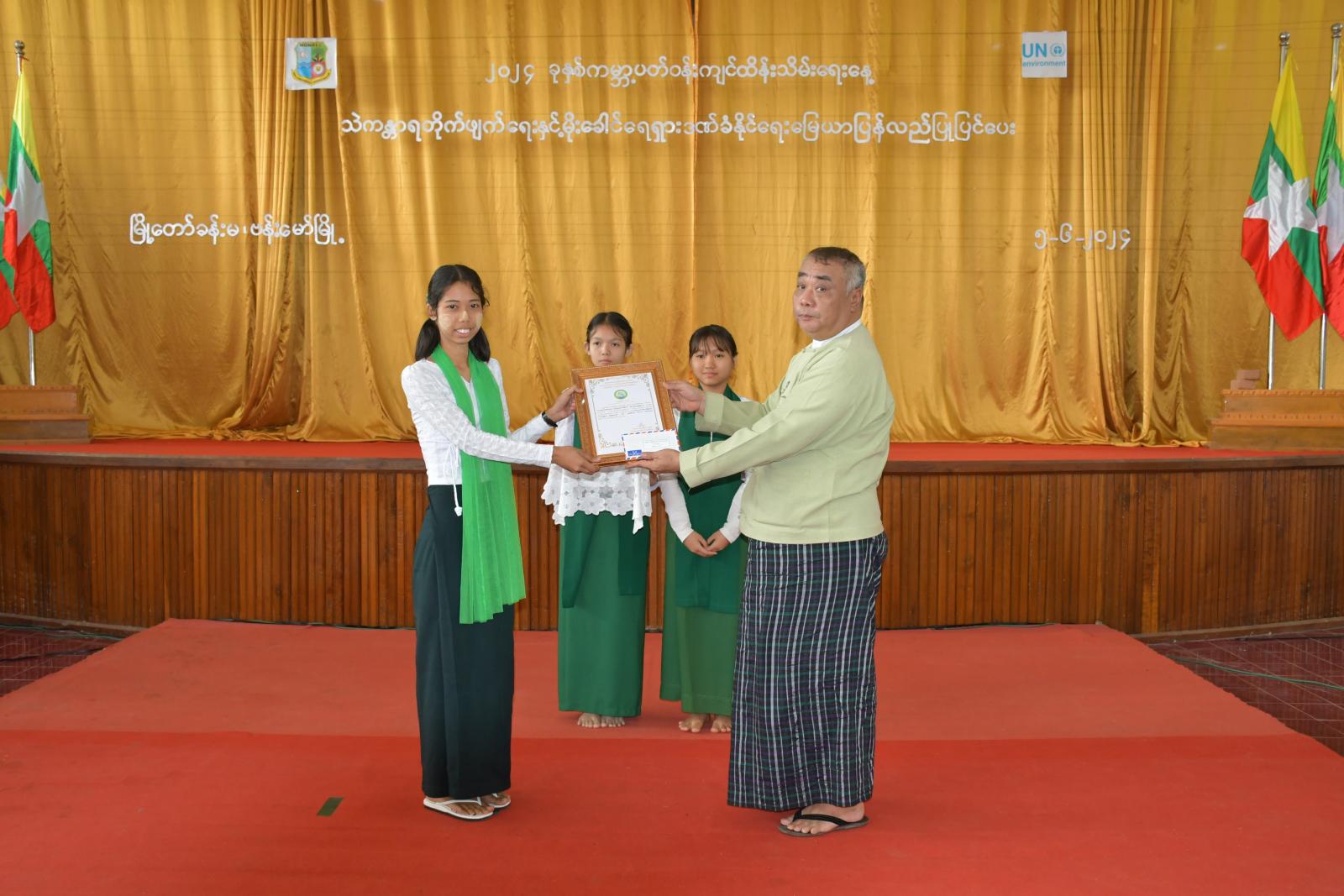 ဆက်လက်၍ ခရိုင်ပတ်ဝန်းကျင်ထိန်းသိမ်းရေးဦးစီးဌာနနှင့် ခရိုင်ပြန်ကြားရေးနှင့်ပြည်သူ့ဆက်ဆံရေးဦးစီးဌာနတို့ ပူးပေါင်းကျင်းပခဲ့သည့် ၂၀၂၄ခုနှစ် ကမ္ဘာ့ပတ်ဝန်းကျင်ထိန်းသိမ်းရေးနေ့အထိမ်းအမှတ် စာစီစာကုံးပြိုင်ပွဲတွင် ထူးချွန်ဆုများရရှိခဲ့သည့် ကျောင်းသား၊ ကျောင်းသူများအား ဂုဏ်ပြုဆုများကို ဌာနဆိုင်ရာတာဝန်ရှိသူများက အသီးသီးပေးအပ်ချီးမြှင့်ခဲ့ကြကြောင်း သိရသည်။