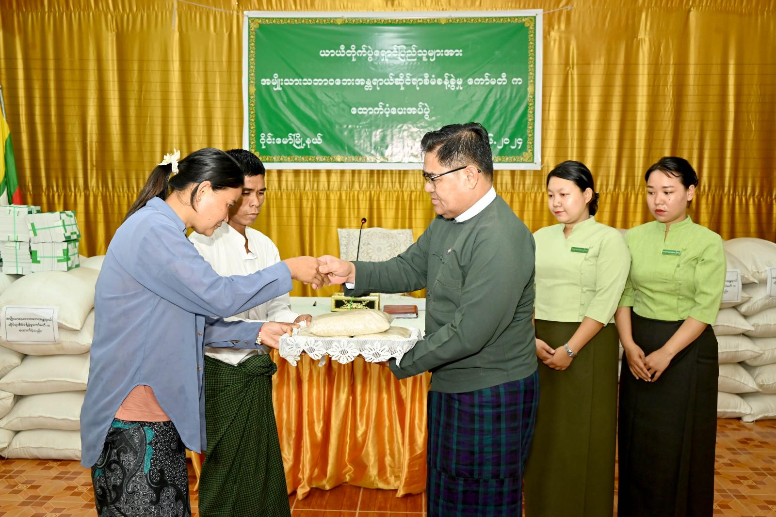 ယင်းနောက် ထောက်ပံ့ပစ္စည်းများ ထောက်ပံ့ပေးအပ်ရာတွင် ပြည်နယ်ဝန်ကြီးချုပ်၊ ပြည်နယ်တရားလွှတ်တော်တရားသူကြီးချုပ်နှင့် ပြည်နယ်ဝန်ကြီးများက ဝိုင်းမော်မြို့နယ်အတွင်းရှိ ကျေးရွာများမှ ဝိုင်းမော်မြို့ပေါ် ရပ်ကွက်များ၊ မိုင်းနား၊ နောင်တာလော၊ နောင်းချိန်း၊ ဝူယန်ကျေးရွာတို့ရှိ ဘာသာရေးအဆောက်အဦများ၊ ယာယီခိုလှုံရာစခန်းများ၊ မြို့ပေါ်ရပ်ကွက်များသို့ ယာယီတိမ်းရှောင်လာသော အိမ်ထောင်စု (၁၅၁၄) စုတို့အတွက် အမျိုးသားသဘာဝဘေးအန္တရာယ်ဆိုင်ရာ စီမံခန့်ခွဲမှုကော်မတီက ထောက်ပံ့သည့် စုစုပေါင်းငွေကျပ် (၁၁၃၅၅၀၀၀၀)တန်ဖိုးရှိ ဆန်အိတ်ပေါင်း (၁၅၁၄) အိတ်နှင့် ကျောင်းနေအရွယ်ကလေးများအတွက် ကျောင်းသုံးဗလာစာအုပ်များကို အသီးသီးထောက်ပံ့ပေးအပ်ခဲ့ကြသည်။