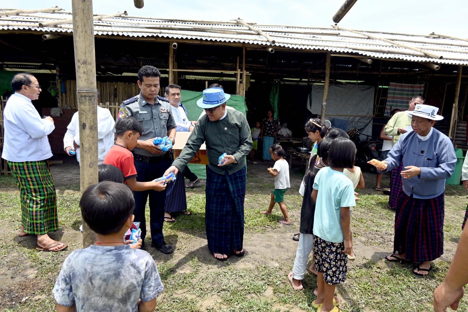 ထိုမှတစ်ဆင့် ပြည်နယ်ဝန်ကြီးချုပ်နှင့် အဖွဲ့ဝင်များသည် ဝိုင်းမော်မြို့ အမှတ်(၅) အေးသာယာရပ်ကွက်အတွင်း ယာယီခိုလှုံနေထိုင်လျက်ရှိသည့် အိမ်ထောင်စုများထံသွားရောက်ပြီး ရင်းရင်းနှီးနှီး လိုက်လံနှုတ်ဆက်အားပေးကြကာ အိမ်ထောင်စုများအား မုန့်များ လိုက်လံဝေငှကျွေးမွေးခဲ့ကြပြီး စခန်းအတွင်း မိသားစုများ နေထိုင်စားသောက်နေမှုအခြေအနေများ၊ သောက်သုံးရေလုံလောက်စွာ ရရှိရေးအတွက် ရေတွင်းများ တူးဖော်ဆောင်ရွက်နေမှုအခြေအနေများ၊ အဆောင်သစ်များ တိုးချဲ့ဆောက်လုပ်နေမှု အခြေအနေများကို လှည့်လည်ကြည့်ရှုစစ်ဆေးပြီး လိုအပ်ချက်များကို စခန်းတာဝန်ခံများ၊ ဌာနဆိုင်ရာတာဝန်ရှိသူများနှင့် ညှိနှိုင်းပေါင်းစပ်ဆောင်ရွက်ပေးခဲ့သည်။