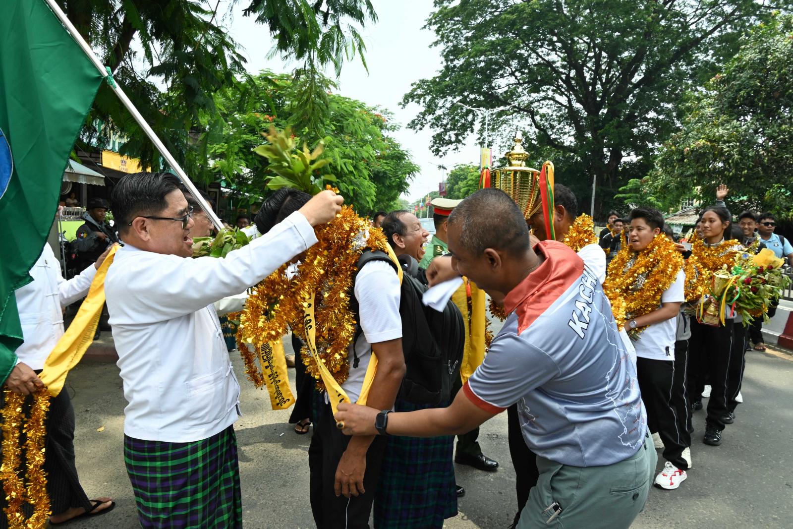 ယင်းနောက် လက်ရွေးစင်အသင်းအား ဂုဏ်ပြုကြိုဆိုချီးမြှင့်မည့် ပြည်သူ့အားကစားကွင်းရှေ့၌ ပြည်နယ်ဝန်ကြီးချုပ် ဦးခက်ထိန်နန်နှင့် ဇနီး ဒေါ်နန်ဆိုင်း၊ ပြည်နယ်တရားလွှတ်တော်တရားသူကြီး ချုပ်နှင့် ဇနီး၊ ပြည်နယ်အစိုးရအဖွဲ့ဝင် ဝန်ကြီးများနှင့် ၎င်းတို့၏ ဇနီးများ၊ တာဝန်ရှိသူများက ဘင်ခရာအဖွဲ့နှင့်အတူ ဂုဏ်ပြုပန်းကုံးများ၊ အောင်သပြေပန်းတို့ဖြင့် ကြိုဆိုခဲ့ကြပြီး မိုးလုံလေလုံ အားကစားခန်းမ၌ ဂုဏ်ပြုပွဲအခမ်းအနားကို ကျင်းပပြုလုပ်ရာ အောင်ပွဲရဂျူဒိုအသင်းက ဆွတ်ခူးရရှိ ခဲ့သည့် အောင်နိုင်ရေးအလံနှင့် တံခွန်စိုက်ဆုဖလားများအား ပြည်နယ်ဝန်ကြီးချုပ်ထံ လွှဲပြောင်းအပ်နှံ ပေးအပ်ခဲ့ကြသည်။