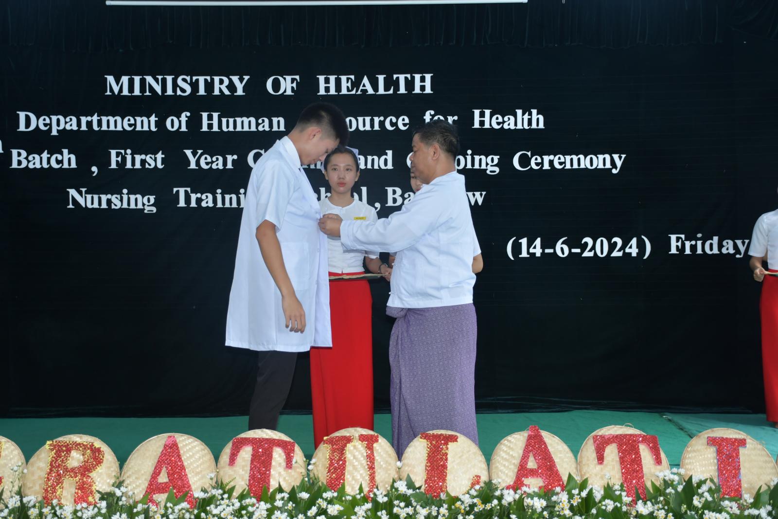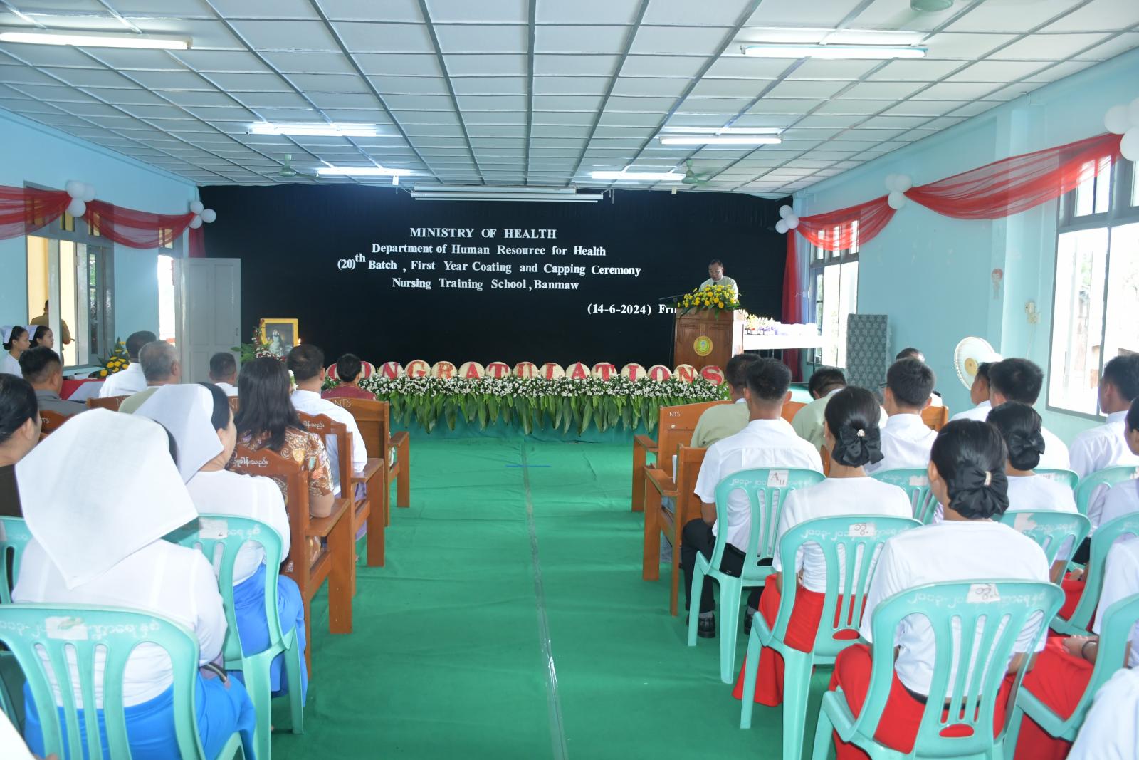 ရှေးဦးစွာ ခရိုင်စီမံအုပ်ချုပ်ရေးအဖွဲ့ဥက္ကဋ္ဌ ဦးအောင်ဇော်လတ်က “နိုင်ငံတော်မှ ငွေကြေးအမြောက်အများ အကုန်အကျခံပြီး သင်တန်းကျောင်းများ ဆောက်လုပ်၍ သင်တန်းသား/သင်တန်းသူများကို မွေးထုတ်ပေးနေခြင်းဟာ နိုင်ငံတော်ချမှတ်ထားတဲ့ ဦးတည်ချက် (၁၂) ရပ်မှာပါတဲ့ လူမှုရေး ဦးတည်ချက်ဖြစ်တဲ့ တစ်မျိုးသားလုံးကျန်းမာကြံ့ခိုင်ရေးနှင့် ပညာရည်မြင့်မားရေးဆိုတဲ့အချက်ကို အကောင်အထည်ဖော်ဆောင်ရွှက်နေခြင်းဖြစ်ကြောင်း ကျန်းမားရေးဝန်ကြီးဌာန အနေနဲ့လည်း အမျိုးသားကျန်းမားရေးမှုဝါဒနှင့် အညီ သူနာပြုသင်တန်းကျောင်းတွေကို ပြည်နယ်ဒေသနဲ့နယ်စပ် ဒေသမှာရှိတဲ့ တိုင်းရင်းသားလူမျိုးများရဲ့ ကျန်းမားရေးတိုးတက်ဖွံ့ဖြိုးလာအောင် အဓိကထားပြီး သူနာပြုများကို မွေးထုတ်ပေးဖို့ ရည်ရွယ်ချက်နဲ့ ဖွင့်လှစ်ခဲ့ခြင်းဖြစ်ကြောင်း သင်တန်းသား/သူများ အနေနဲ့ပညာကို သင်ယူတဲ့အခါမိမိတို့ သူနာပြုများရဲ့ဂုဏ်သိက္ခာညှိုးနွမ်း စေမည့်မည်သည့်အပြုအမူ မျိုးမှ မပြုမိစေဖို့ နေထိုင်ကြရမှာဖြစ်သလို လုပ်ငန်းခွင်ရောက်သည့် အခါမှာလည်း လုပ်ငန်းခွင် စည်းကမ်းကို လိုက်နာကြဖို့ မှာကြားလိုကြောင်းနှင့် ခေတ်နှင့် အညီဖွံ့ဖြိုးတိုးတက်နေသည့် ဆေးပညာဘာသာရပ်များနှင့် လိုက်လျောညီထွေတဲ့ သူနာပြုအတတ်ပညာများကို ကျွမ်းကျင်တတ် မြောက်အောင်သင်ယူပြီး အရည်အသွေးပြည့်ဝတဲ့ သူနာပြုကောင်းများဖြစ်အောင် ဆက်လက်ကြိုးစားစေလိုကြောင်း’’ အဖွင့်အမှာစကား ပြောကြားခဲ့ပြီး ဗန်းမော်ပြည်သူ့ဆေးရုံးကြီးမှ ဆေးရုံးအုပ်ကြီး ဒေါက်တာအောင်ကျော်စိုးမှ ဆုံးမဩဝါဒစကား ပြောကြားခဲ့သည်။ ဗန်းမော်သူနာပြု သင်တန်းကျောင်းအုပ်ကြီး ဒေါ်နွယ်နွယ်စိုးမှ Coating and capping နှင့် ပတ်သက်၍ ဂုဏ်ပြု အမှာစကားပြောကြားခဲ့ပြီး သူနာပြုနှင့် သားဖွားသင်တန်းကျောင်းမှ ကျောင်းအုပ်ဆရာမကြီးနှင့် တာဝန်ရှိသူများက သူနာပြုသားဖွားဒီပလိုမာ ပထမနှစ်သင်တန်းသား/ သင်တန်းသူများအား ဂျူတီကုတ်နှင့် ဦးဆောင်းများ အပ်နှင်းခဲ့ကြသည်။