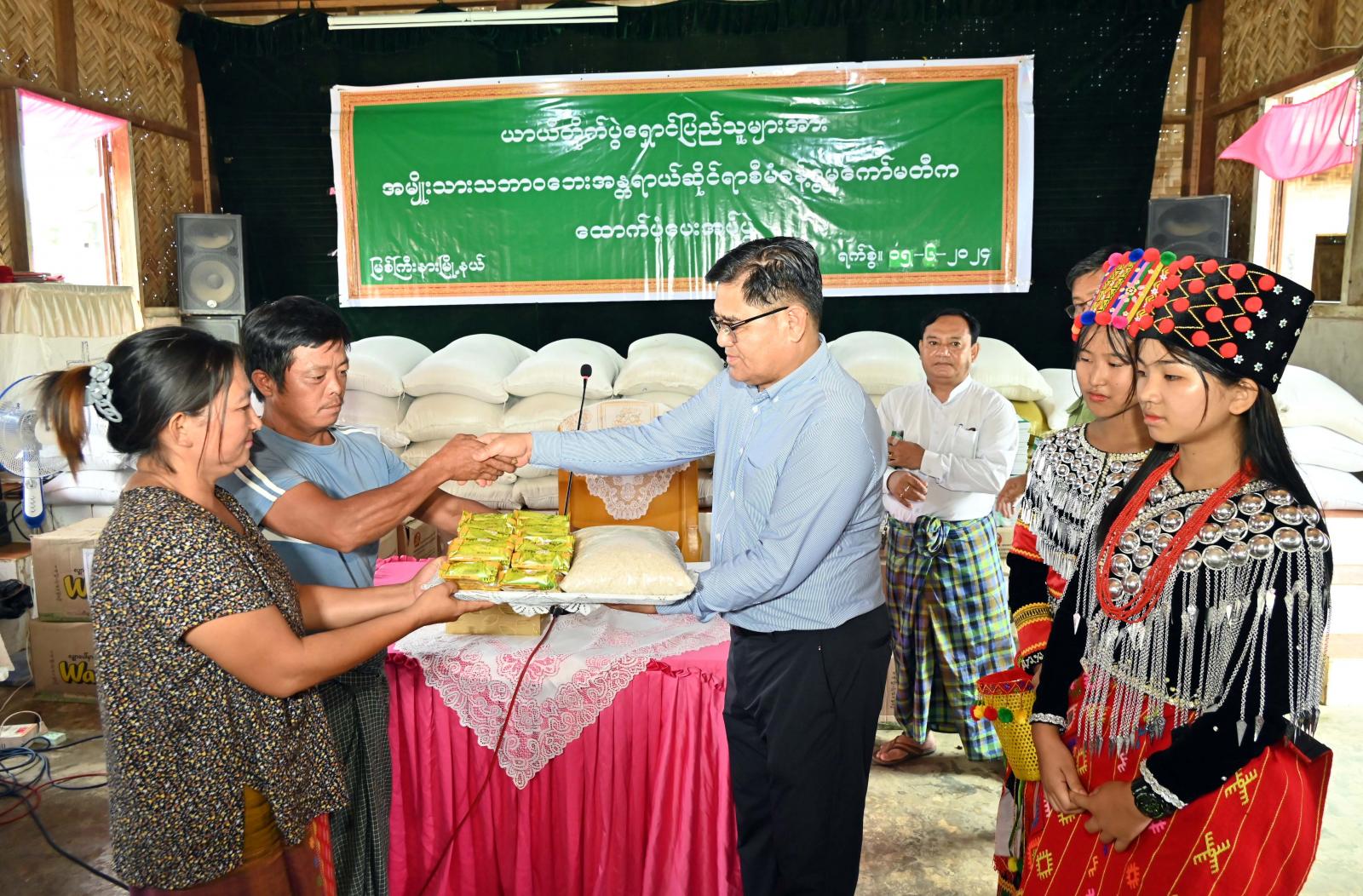 ဆက်လက်၍ ပြည်နယ်ဝန်ကြီးချုပ်က အဆိုပါအသင်းတော်ပိုင်မြေနေရာများတွင် ယာယီခိုလှုံ နေထိုင် လျက်ရှိသော အိမ်ထောင်စု (၉၉)စု၊ လူဦးရေ (၅၄၆)ဦးတို့အတွက် အမျိုးသားသဘာဝဘေး အန္တရာယ် ဆိုင်ရာစီမံခန့်ခွဲမှုကော်မတီက ထောက်ပံ့သည် ငွေကျပ် ၇၄၂၅၀၀၀ တန်ဖိုးရှိ ဆန်အိတ် ပေါင်း ၉၉ အိတ်၊ ပြည်နယ်အစိုးရအဖွဲ့က ထောက်ပံ့သည့် ငွေကျပ် ၁၅၈၄၀၀၀ တန်ဖိုးရှိ ခေါက်ဆွဲ ခြောက်ဖာ ၉၉ ဖာတို့နှင့် ပြည်နယ်ပညာရေးမှူးရုံးနှင့် အလှူရှင်များက ထောက်ပံ့သည့် ကျောင်းသုံး ဗလာစာအုပ်နှင့် စာရေးကိရိယာများအား ထောက်ပံ့ပေးအပ်သည်။