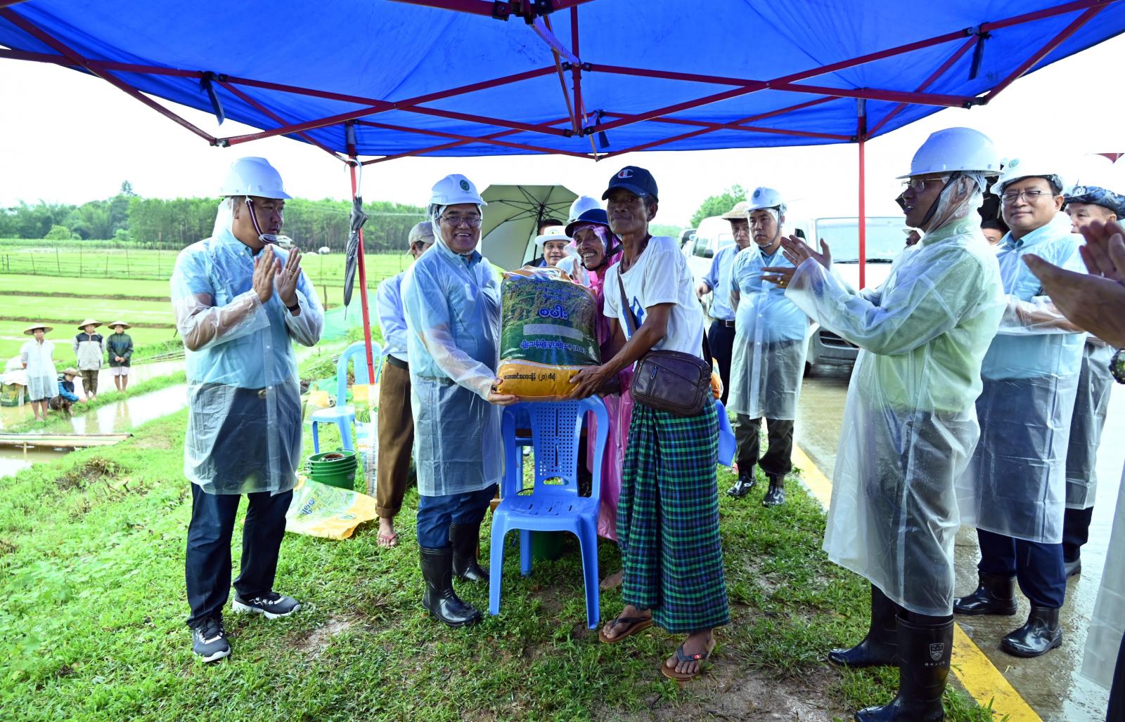အခမ်းအနားတွင် ပြည်နယ်စိုက်ပျိုးရေးဦးစီးဌာန၊ ပြည်နယ်ဦးစီးမှူး ဦးဌေးလွင်က မိုးစပါး ဘောင်တင်စနစ်ဖြင့် စိုက်ပျိုးခြင်းဖြင့် ရရှိနိုင်သည့် အကျိုးကျေးဇူးများနှင့် ပန်းတိုင်အထွက်နှုန်း တိုးပွားရေးအတွက် စိုက်ပျိုးနည်းစနစ် ပြောင်းလဲနိုင်သည့် အခြေအနေများကို ရှင်းလင်းတင်ပြပြီး ပြည်နယ်ဝန်ကြီးချုပ်က ဒေသခံတောင်သူများအား မိုးစပါးပန်းတိုင်အထွက်နှုန်းရရှိရေးအပြင် သီးထပ် စိုက်ပျိုးနိုင်ရေး လိုအပ်ချက်များကို မေးမြန်းဆွေးနွေးကာ စိုက်ပျိုးရေလုံလောက်စွာရရှိရေး၊ ကျွဲ/နွား အန္တရာယ်အတွက် ခြံဝင်းခတ်ပေးနိုင်ရေး၊ လိုအပ်သည့် မျိုးကောင်းမျိုးသန့်နှင့် မြေသြဇာလုံလောက် စွာသုံးစွဲနိုင်ရေး တာဝန်ရှိသူများနှင့် ပေါင်းစပ်ညှိနှိုင်း၍ ဖြည့်ဆည်းဆောင်ရွက်ပေးခဲ့ပြီး တောင်သူများ အတွက် မျိုးကောင်းမျိုးသန့် အထွက်တိုး ဆင်းဧကရီ-၃ မျိုးစပါးအိတ်များကို ထောက်ပံ့ပေးအပ် ခဲ့သည်။