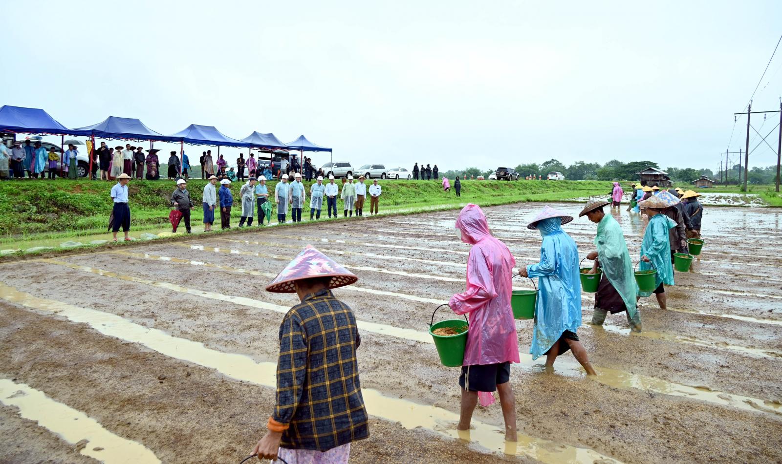 ယင်းနောက် ပြည်နယ်ဝန်ကြီးချုပ်နှင့် အဖွဲ့ဝင်များသည် တောင်သူများနှင့်အတူ စိုက်ကွင်း အတွင်း မျိုးကောင်းမျိုးသန့် အထွက်တိုးဆင်းဧကရီ-၃ မျိုးစပါးများအား စိုက်ပျိုးရေးဦးစီးဌာန ဝန်ထမ်း များနှင့် ဒေသခံတောင်သူများက တောင်သူအသိပညာပေး ဘောင်တင်စနစ်ဖြင့် မိုးစပါး စုပေါင်းချကြဲ ပက်ခြင်းကို ကြည့်ရှုအားပေးခဲ့ကြကြောင်း သိရသည်။
