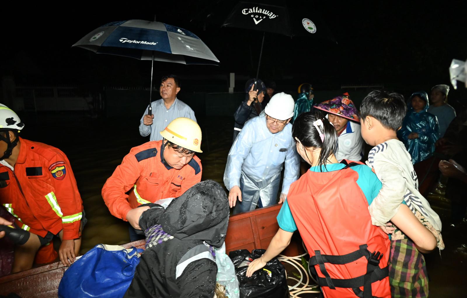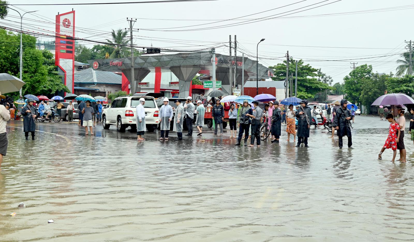 ထို့နောက် ပြည်နယ်ဝန်ကြီးချုပ်နှင့် တာဝန်ရှိသူများသည် မြစ်ကြီးနားမြို့ စီတာပူတံတားအနီး ပြည်နယ်တိုင်းရင်းသားရေးရာဝန်ကြီးဦးဆောင်၍ ဌာနဆိုင်ရာများ၊ မီးသတ်တပ်ဖွဲ့ဝင်များနှင့် စုဖွဲ့၍ ရပ်ကွက်ရေဝင်ရောက်မှုအပေါ် ရှာဖွေကယ်ဆယ်ရေးနှင့် ကူညီထောက်ပံ့ရေးလုပ်ငန်းများ ဆောင်ရွက်နေမှုအခြေအနေများကိုလည်းကောင်း၊ လယ်ကုန်းရပ်ကွက်အတွင်း သယံဇာတရေးရာဝန်ကြီးဦးဆောင်၍ အစုအဖွဲ့ဖြင့် ရှာဖွေကယ်ဆယ်ရေးနှင့် ကူညီထောက်ပံ့ကျွေးမွေးရေးဆိုင်ရာများကိုလည်းကောင်း၊ မြို့သစ်ရပ်ကွက်အတွင်း ပြည်ထောင်စုလမ်းနှင့် မဟာဗန္ဓုလလမ်းဆုံနေရာမှ ခရိုင်စီမံအုပ်ချုပ်ရေးအဖွဲ့ဥက္ကဋ္ဌဦးဆောင်၍ ရဲတပ်ဖွဲ့ဝင်များ၊ မီးသတ်တပ်ဖွဲ့ဝင်များစုဖွဲ့၍ ကယ်ဆယ်ရေးလုပ်ငန်းများ ဆောင်ရွက်နေမှု၊ နေအိမ်များသို့ ပြန်လည်ရွေ့ပြောင်းနေထိုင်မည့် အိမ်ထောင်စုများအား ကူညီဆောင်ရွက်ပေးနေမှုများကိုလည်းကောင်း လှည့်လည်ကြည့်ရှုအားပေးခဲ့ကြပြီး ဌာနဆိုင်ရာများနှင့် လူမှုကူညီရေးအသင်းအဖွဲ့များက ရေဘေးရှောင်မိသားစုများအတွက် နေ့လည်စာထမင်းဘူးများကို စက်လှေများဖြင့် လိုက်လံထောက်ပံ့ပေးအပ်ခဲ့ကြသည်။