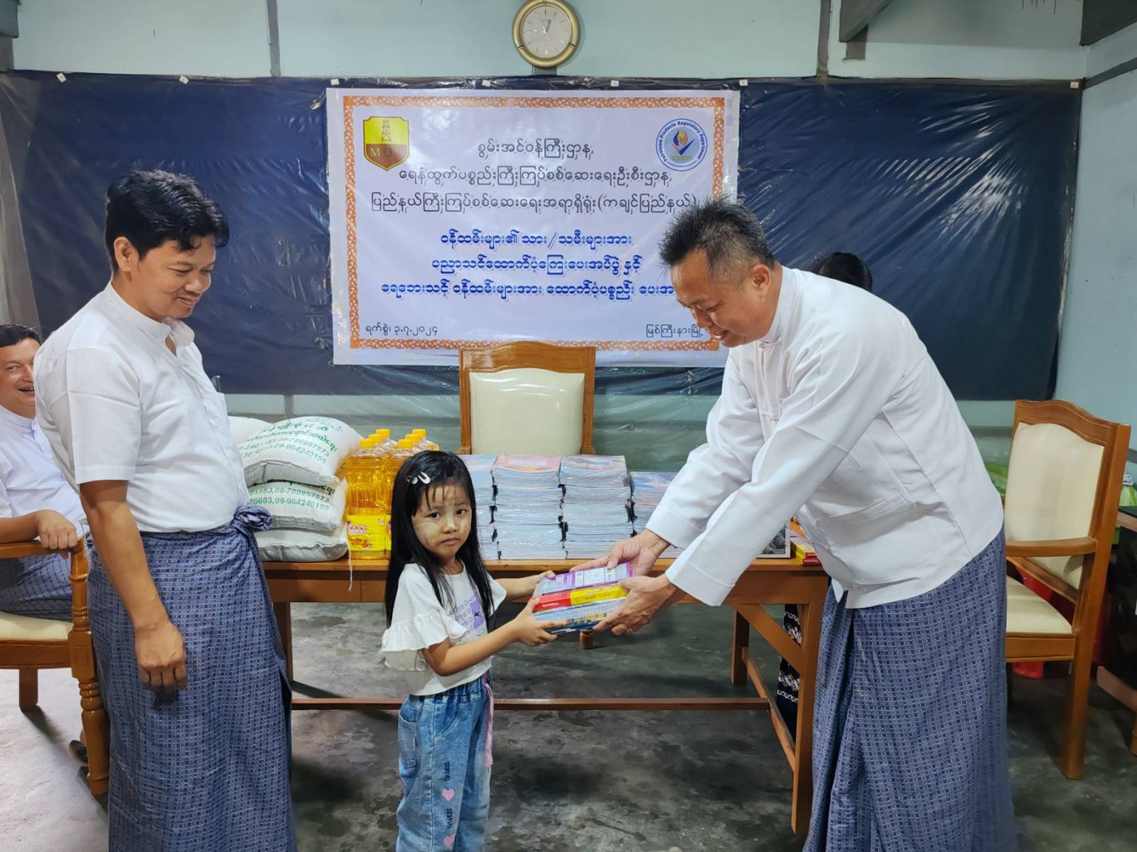 အခမ်းအနားတွင် စွမ်းအင်ဝန်ကြီးဌာန၊ ရေနံထွက်ပစ္စည်းကြီးကြပ်စစ်ဆေးရေးဦးစီးဌာန၊ ကချင်ပြည်နယ်ကြီးကြပ်စစ်ဆေးရေးအရာရှိရုံးမှ ပြည်နယ်ဦးစီးမှူးဦးမင်းမင်းနှင့်တာဝန်ရှိသူများက ဦးစီးဌာနရှိဝန်ထမ်းများ၏ သား/သမီး (၂၁)ဦးအား ဗလာစာအုပ်၊ ခဲတံ၊ ဘောပင်နှင့် အခြားကျောင်းသုံးပစ္စည်းများကိုလည်းကောင်း၊ ရေဘေးသင့်ဝန်ထမ်း(၆)ဦးအား အခြေခံစားသောက်ကုန်များဖြစ်သည့် ဆန်၊ ဆီ၊ ဆားတို့ကိုလည်းကောင်း ထောက်ပံ့ပေးအပ်ခဲ့ကြောင်း သတင်းရရှိသည်။