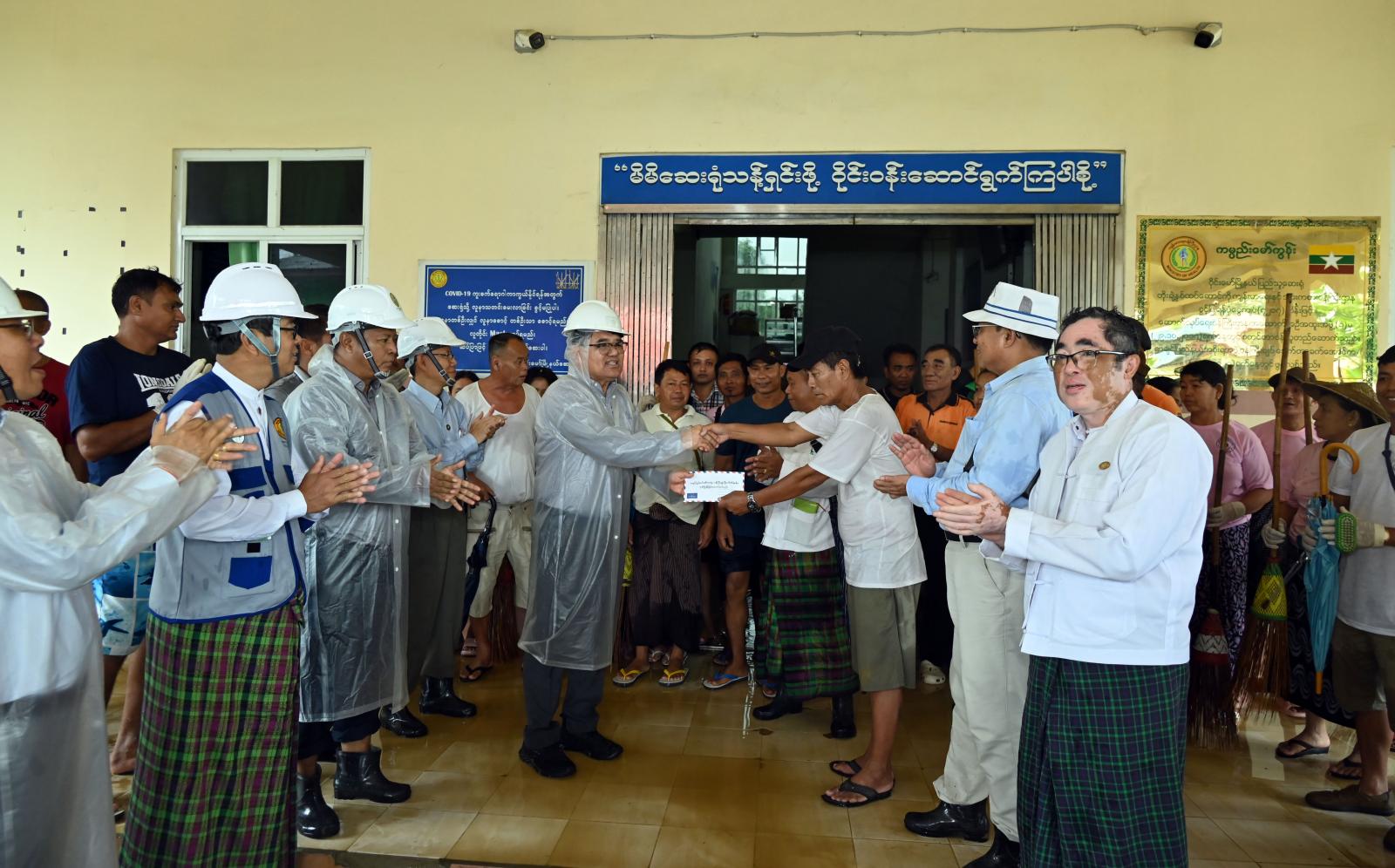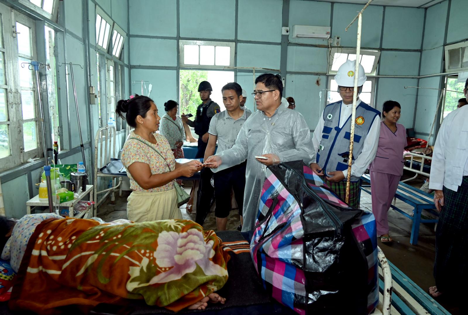 ထို့နောက်ပြည်နယ်ဝန်ကြီးချုပ်နှင့်အဖွဲ့ဝင်များသည် ဝိုင်းမော်မြို့နယ် ပြည်သူ့ဆေးရုံသို့ သွားရောက်ပြီး ရေကြီးရေလျှံမှုကြောင့် ရေနစ်မြှုပ်ခဲ့သည့် ဆေးရုံ (၂)ထပ်လူနာဆောင်သစ်အား ဌာနဆိုင်ရာများ၊ ကျန်းမာရေးဝန်ထမ်းများ၊ မီးသတ်တပ်ဖွဲ့ဝင်များနှင့် လူမှုကူညီရေးအသင်းအဖွဲ့များက စုပေါင်းသန့်ရှင်းရေးလုပ်ငန်းများ ဆောင်ရွက်နေမှုများကို လိုက်လံကြည့်ရှုအားပေးခဲ့ကြပြီး ပြည်နယ် ဝန်ကြီးချုပ်က သန့်ရှင်းရေးဆောင်ရွက်ကြသည့် ဌာန/အဖွဲ့အစည်းများအတွက် ထောက်ပံ့ငွေများကို ထောက်ပံ့ပေးအပ်ကာ ဆေးရုံအတွင်း တက်ရောက်ဆေးဝါးကုသမှုခံယူနေသော လူနာများအား ရင်းရင်းနှီးနှီး လိုက်လံနှုတ်ဆက်အားပေးကာ ထောက်ပံ့ငွေများကို ထောက်ပံ့ပေးအပ်ခဲ့သည်။