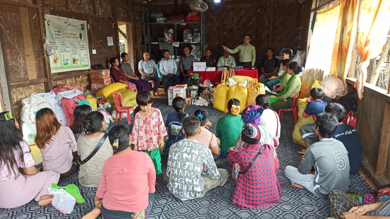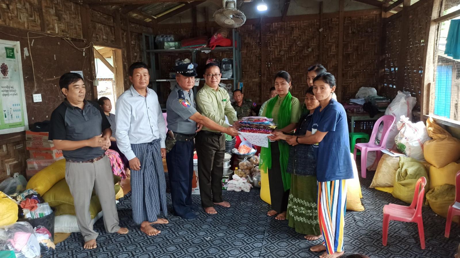 ရှေးဦးစွာ ခရိုင်စီမံအုပ်ချုပ်ရေးအဖွဲ့ဥက္ကဋ္ဌ ဦးသက်နိုင်နှင့် အမှတ်(၁၀၅)ခြေလျင်တပ်ရင်းမှ ယာယီတပ်ရင်းမှူး ဗိုလ်မှူးအောင်ပြေငြိမ်း၊ မြို့နယ်စီမံအုပ်ချုပ်ရေးအဖွဲ့ဥက္ကဋ္ဌ ဦးချစ်စမ်းအောင်တို့က မီးဘေးသင့် အိမ်ထောင်စုဝင်များအား အသီးသီးအားပေးစကားများ ပြောကြားခဲ့ကြပြီး သက်ဆိုင်ရာတာဝန်ရှိသူများက ဌာနဆိုင်များနှင့် စေတနာရှင်ပြည်သူများ လှူဒါန်းသည့် ထောက်ပံ့ငွေကျပ်သိန်း(၃၀)၊ အဝတ်အစားနှင့် အိမ်သုံးပစ္စည်းများ အသီးသီး ထောက်ပံ့ပေးအပ်ခဲ့သည်။