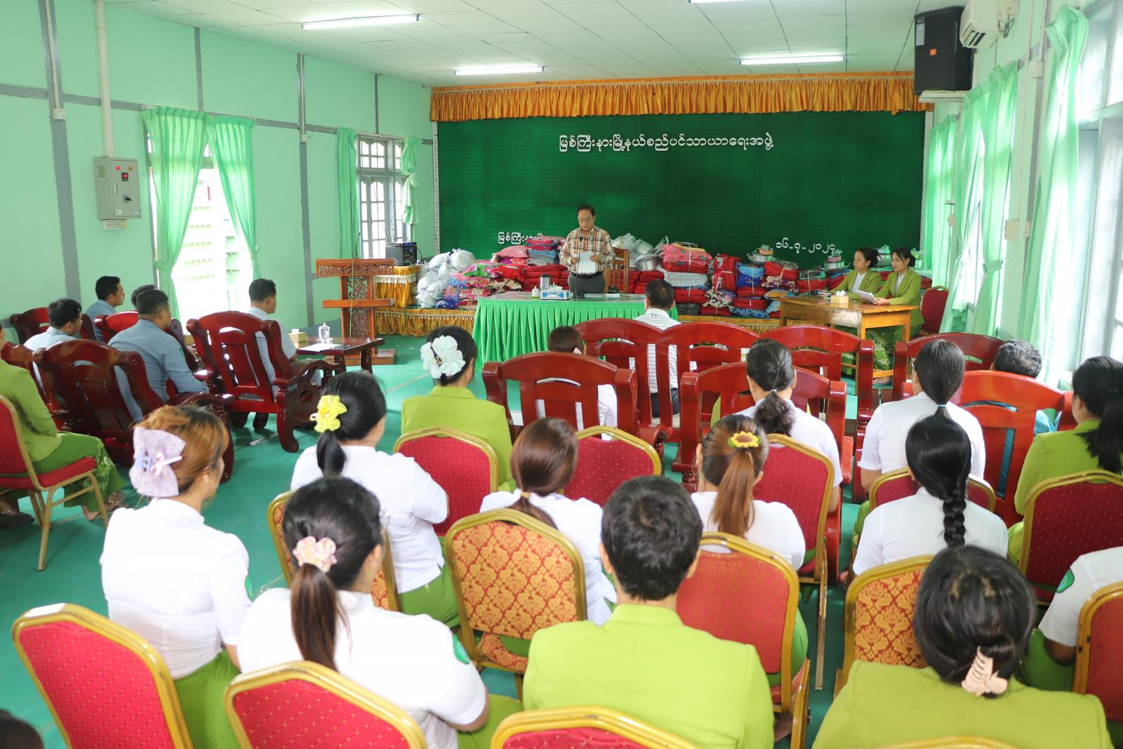 ထို့နောက် ပြည်နယ်ဝန်ကြီးနှင့် တာဝန်ရှိသူများက ရေဘေးသင့်ခဲ့သည် အမြဲတမ်းနှင့် နေ့စားဝန်ထမ်းအိမ်ထောင်စု (၁၀၉) စုတို့အတွက် တန်ဖိုးငွေကျပ် (၁၆၃၅၀၀၀၀) ရှိ စောင်၊ ခြင်ထောင်၊ ခေါင်အုံး၊ အိပ်ရာခင်း၊ ပုဆိုး၊ လုံချည် စသည့်အဝတ်အထည်များနှင့် မီးဖိုချောင်သုံးပစ္စည်းများကို အသီးသီးထောက်ပံ့ပေးအပ်ခဲ့ကြောင်း သိရသည်။