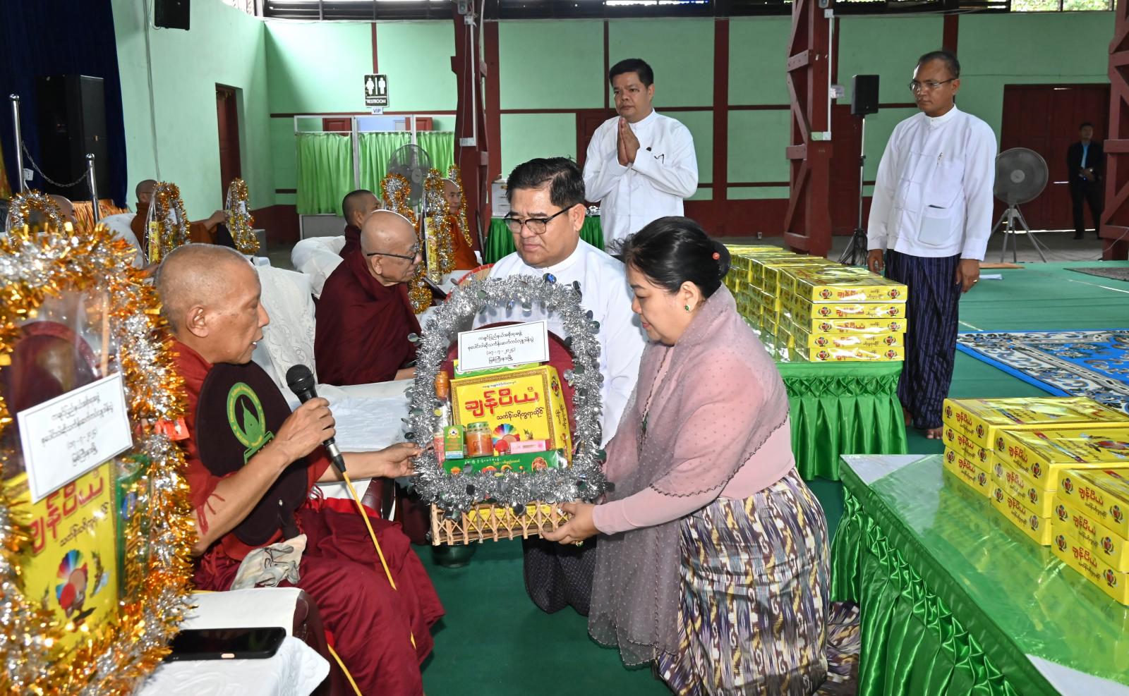 ရှေးဦးစွာ အခမ်းအနားကို နမောတဿ ၃ ကြိမ်ရွတ်ဆို ဘုရားကန်တော့ဖွင့်လှစ်ခဲ့ကြပြီး ပြည်နယ်ဝန်ကြီးချုပ် ဦးခက်ထိန်နန်နှင့် ဇနီးဒေါ်နန်ဆိုင်း၊ ပြည်နယ်တရားလွှတ်တော်တရားသူကြီးချုပ်၊ ပြည်နယ်အစိုးရအဖွဲ့ဝင် ဝန်ကြီးများနှင့် ၎င်းတို့၏ဇနီးများ၊ ပြည်နယ်ဥပဒေချုပ်၊ ပြည်နယ်/ ခရိုင်/မြို့နယ်အဆင့်ဌာနဆိုင်ရာတာဝန်ရှိသူများက ဆရာတော်/သံဃာတော်များထံမှ ငါးပါးသီလခံယူ ဆောက်တည်ခဲ့ကြပြီး ပရိတ်တရားတော်များနာယူခဲ့ကြကာ ဆရာတော်/ သံဃာတော်များအား ဝါဆိုသင်္ကန်း၊ လှူဖွယ်ပစ္စည်းများနှင့် အလှူငွေများကို ဆက်ကပ်လှူဒါန်းခဲ့သည်။