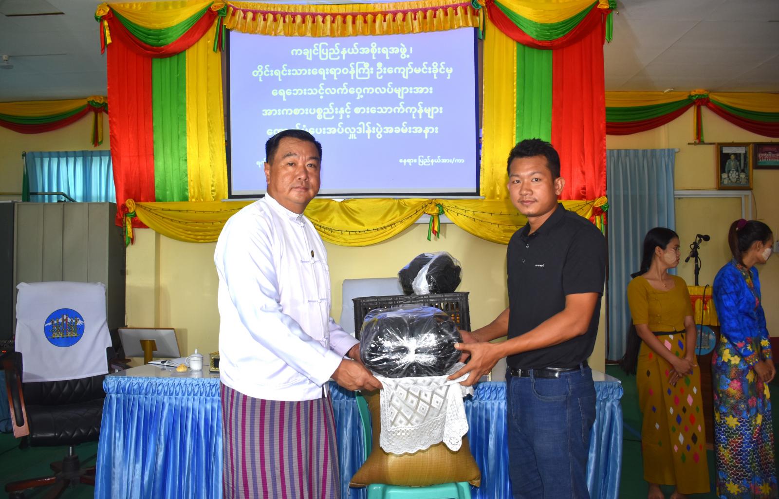 ဆက်လက်ပြီး ပြည်နယ်တိုင်းရင်းသားရေးရာဝန်ကြီး ဦးကျော်မင်းခိုင်က ထောက်ပံ့ပစ္စည်းများ ပေးအပ်ရသည့် ရည်ရွယ်ချက်များအား ရှင်းလင်းပြောကြားကာ ပြည်နယ်ဝန်ကြီးက ရေဘေးသင့် Kick Boxing Camp Kachin (KCK) ကလပ်၊ ဟူးကောင်းကျားကလပ်၊ ရွှေအောင်လှံကလပ်၊ တစ်ကောင်ကျားကလပ်နှင့် ဦးဒဿကလပ်တို့အတွက် အခြေခံစားသောက်ကုန်များဖြစ်သည့် ဆန်(၁၀)အိတ်၊ ဆီ(၅၀)ဗူးနှင့် လက်ဝှေ့အားကစားပစ္စည်းများ ထောက်ပံ့ပေးအပ်ခဲ့ရာ ကလပ်အသင်းများမှ တာဝန်ရှိသူများက လက်ခံရယူခဲ့သည်။