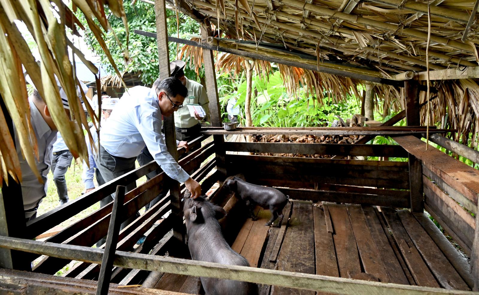 ထိုနောက် ပြည်နယ်ဝန်ကြီးချုပ်နှင့် အဖွဲ့ဝင်များသည် ပူတောင်းကျေးရွာသို့ သွားရောက်ပြီး အဆိုပါ ကျေးရွာအတွင်း မွေးမြူရေးတောင်သူဦးရေ(၄၀)ဦး အစုအဖွဲ့ဖြင့် နေအိမ်ခြံဝင်းများအတွင်း နိုင်ငံ့စီးပွားမြှင့်တင်ရေး ရန်ပုံငွေ ဒုတိယနှစ်စက်ဝန်းမှ ငွေကျပ်သိန်း ၂၀၀ ဖြင့် ဝက်မွေးမြူရေးလုပ်ငန်း များ ဆောင်ရွက်ထားရှိမှုကို ကြည့်ရှုစစ်ဆေးခဲ့ကြပြီး ပြည်နယ်ဝန်ကြီးချုပ်နှင့် တာဝန်ရှိသူများက တောင်သူများအတွက် မွေးမြူရေးအထောက်အကူပြု ဆေးဝါးပစ္စည်းများ၊ အာဟာရ ဖြည့်စွက်အစာ များနှင့် ခြံဖြန်းပိုးသတ်ဆေးများ၊ စစ်ဗျူဟာ(အခြေချ)ပူတာအိုရှိ နွားမွေးမြူရေးခြံအတွက် အလားတူ မွေးမြူရေးအထောက်အကူပြု ဆေးဝါးပစ္စည်းများကို ထောက်ပံ့ပေးအပ်ခဲ့ကြပြီး ပြည်နယ်မွေးမြူရေးနှင့်ကုသရေးဦးစီးဌာန ပြည်နယ်ဦးစီးမှူးက ထောက်ပံ့ပေးအပ်သည့် ဆေးဝါးပစ္စည်းများနှင့် အာဟာရ ဖြည့်စွက်စာများ နည်းစနစ်ကျ သုံးစွဲကျွေးမွေးနိုင်ရေး အသိပညာပေး ဟောပြောခဲ့သည်။