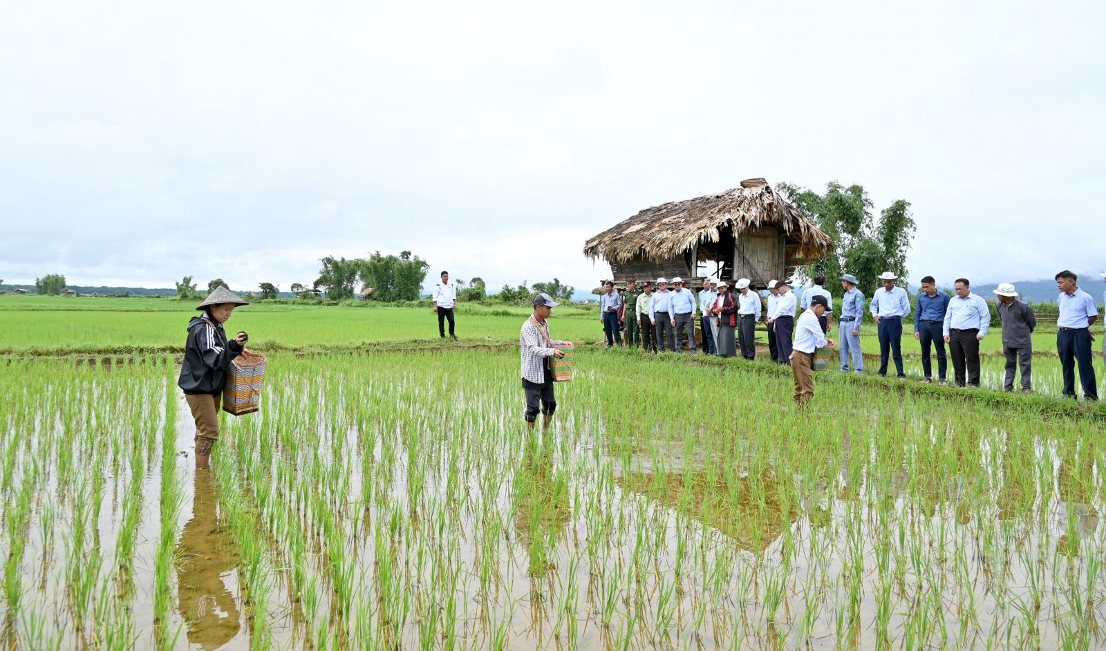 ယင်းနောက်အဆိုပါကျေးရွာအတွင်းရှိ ပူတောင်းကွင်း မိုးစပါးစိုက်ပျိုးဧရိယာ ၄၀၀ ကျော်ရှိသည့်အနက် ကွင်းအမှတ် (၃၂)၊ တောင်သူ ဦးအကူးဒီး၏ လယ်၌ စိုက်ပျိုးထားသည့် ဆင်းဧကရီ-၃ အထွက်တိုးမျိုးသန့်စပါးခင်းအား စိုက်ပျိုးရေးဦးစီးဌာနဝန်ထမ်းများနှင့် ဒေသခံတောင်သူတို့၏ သဘာဝဓာတ်မြေသြဇာ တောင်သူအသိပညာပေး သရုပ်ပြကျဲပက်ခြင်းကို ကြည့်ရှုအားပေးခဲ့ကြသည်။