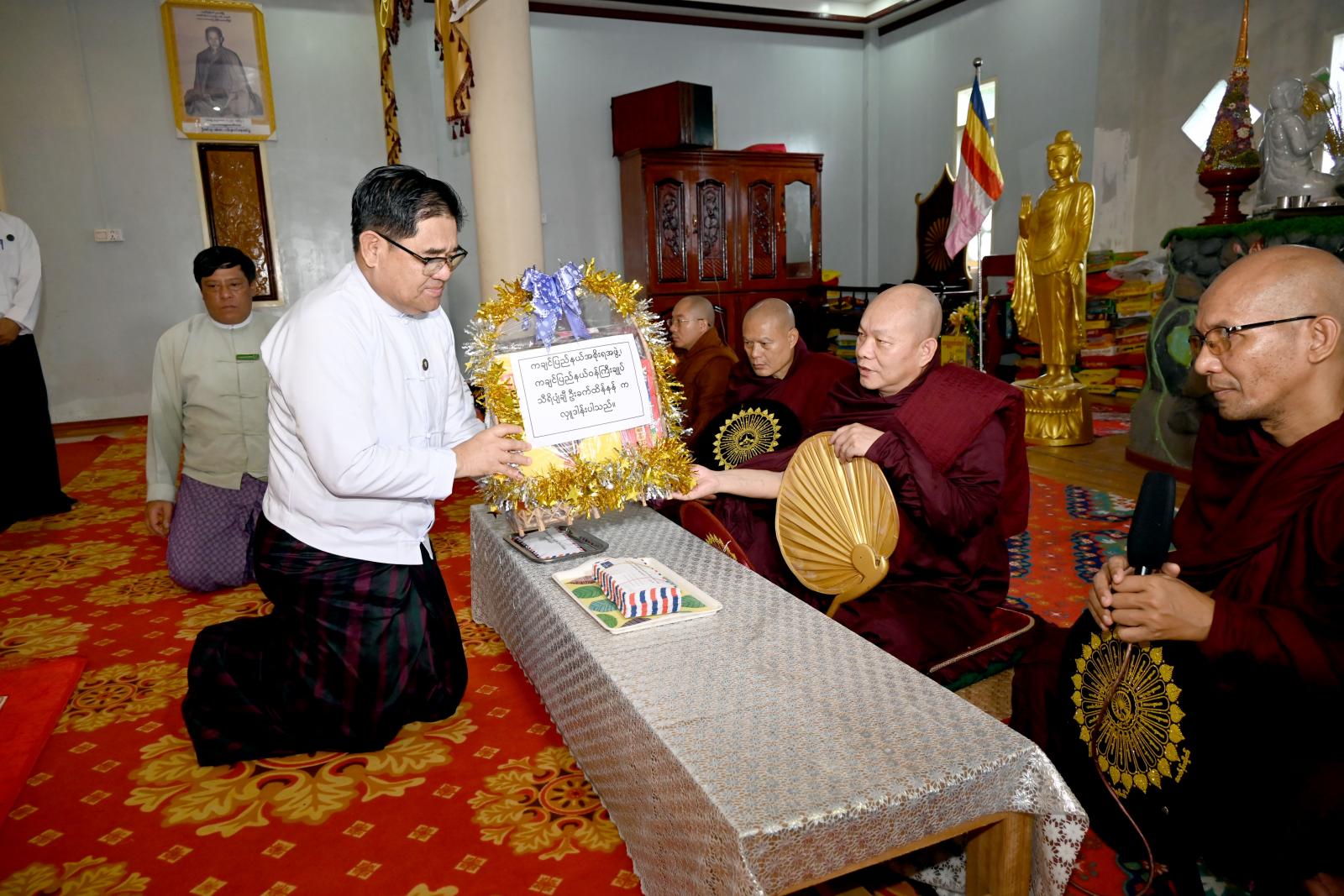 ထိုမှတစ်ဆင့် မြို့မရပ်ကွက်၊ တောင်တန်းသာသနာပြုဗဟိုကျောင်းတိုက်၌ ကျင်းပပြုလုပ်သည့် ဝါဆိုသင်္ကန်းဆက်ကပ်လှူဒါန်းပွဲ အခမ်းအနားသို့တက်ရောက်ပြီး မြို့နယ်သံဃနာယကအဖွဲ့ဥက္ကဋ္ဌ၊ ဟိုခိုကျောင်းတိုက်ဆရာတော် ဘဒ္ဒန္တအာဒိစ္စရံသီ အမှူးပြုသော ဆရာတော်၊ သံဃာတော်များထံမှ ငါးပါးသီလခံယူဆောက်တည်ခဲ့ကြပြီး ဝါဆိုသင်္ကန်း၊ လှူဖွယ်ပစ္စည်းများနှင့် အလှူငွေများကို လှူဒါန်းခဲ့ကြကာ အနုမောဒနာတရားတော်များ နာယူခြင်း၊ လှူဒါန်းမှုအစုစုတို့အတွက် ရေစက်သွန်း ချအမျှပေးဝေခြင်းတို့ ဆောင်ရွက်ခဲ့ကြသည်။