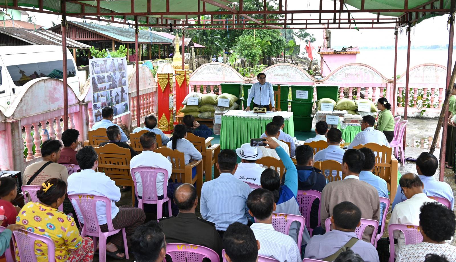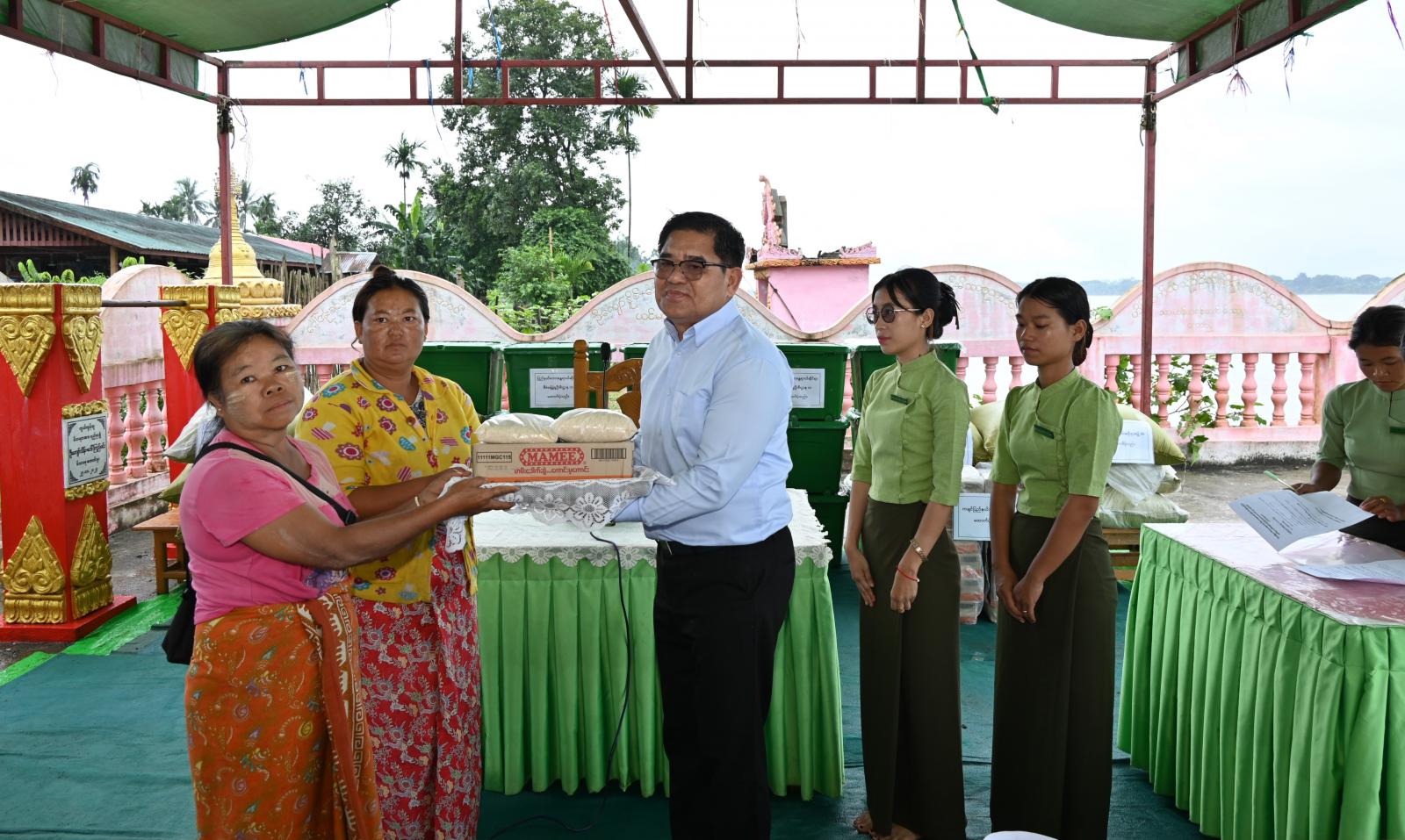 ယင်းနောက် ပြည်နယ်ဝန်ကြီးချုပ်က မြစ်ရေတိုက်စားမှုကြောင့် နေအိမ်ပျက်စီးဆုံးရှုံးခဲ့သည့် မိသားစု ၁၈ စု၊ လူဦးရေ ၁၀၉ ဦးတို့အတွက် တန်ဖိုးငွေကျပ် စုစုပေါင်း ၁၆၂၉၀၀၀ တန်ဖိုးရှိ တစ်အိမ်ထောင်လျှင် ဆန်(၁)အိတ်နှုန်းဖြင့် ဆန်အိတ်စုစုပေါင်း (၁၈)အိတ်၊ ခေါက်ဆွဲခြောက်ဖာ (၁၈)ဖာတို့အား လည်းကောင်း၊ ပြည်နယ်လူမှုရေးရာဝန်ကြီးနှင့် ပြည်နယ်ဘေးအန္တရာယ်ဆိုင်ရာစီမံခန့်ခွဲမှုဦးစီးဌာန၊ ပြည်နယ်ဦးစီးမှူးတို့က လူမှုဝန်ထမ်း၊ ကယ်ဆယ်ရေးနှင့် ပြန်လည်နေရာချထားရေးဝန်ကြီးက ထောက်ပံ့သည့် အိမ်ထောင်စုတစ်ခုလျှင် ကယ်ဆယ်ရေးပစ္စည်း (၁၆)မျိုးပါပုံး (၁)ပုံးစီဖြင့် စုစုပေါင်း (၁၈)ပုံးကိုလည်းကောင်း အသီးသီးထောက်ပံ့ပေးအပ်ခဲ့ကြသည်။