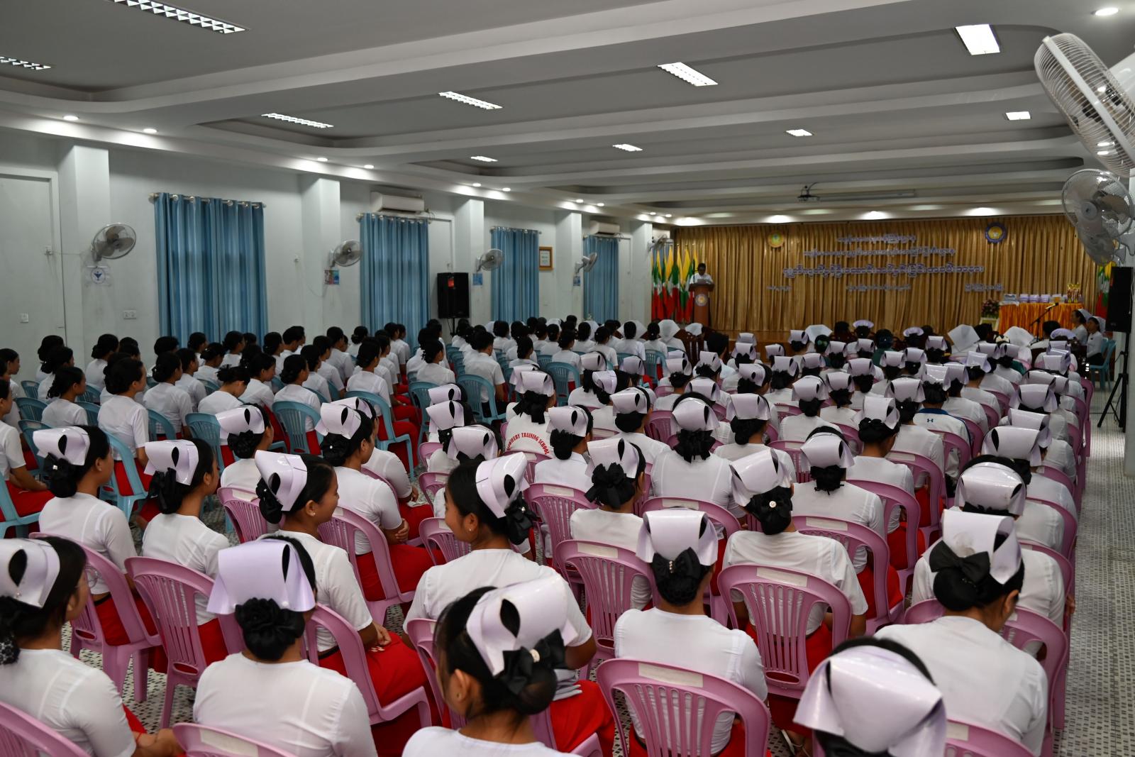ကျန်းမာရေးဝန်ကြီးဌာန၊ ကျန်းမာရေးလူ့စွမ်းအားအရင်းအမြစ်ဦးစီးဌာန၊ ကချင်ပြည်နယ် မြစ်ကြီးနားသူနာပြုသင်တန်းကျောင်းနှင့် သားဖွားသင်တန်းကျောင်းတို့၌ ၂၀၂၄ ခုနှစ် ပညာသင်နှစ်အတွင်း တက်ရောက်ခွင့်ရခဲ့ကြသည့် ပထမနှစ် သူနာပြု-သားဖွားဒီပလိုမာ သင်တန်းသား/ သင်တန်းသူများအား ဂျူတီကုတ်နှင့် ဦးဆောင်းအပ်နှင်းခြင်းအခမ်းအနားကို သြဂုတ် ၁ ရက် နံနက် ၉ နာရီက သူနာပြုသင်တန်းကျောင်း (မြစ်ကြီးနား) အစည်းအဝေးခန်းမ၌ ကျင်းပပြုလုပ်သည်။