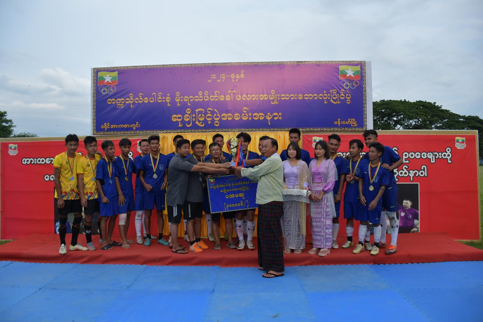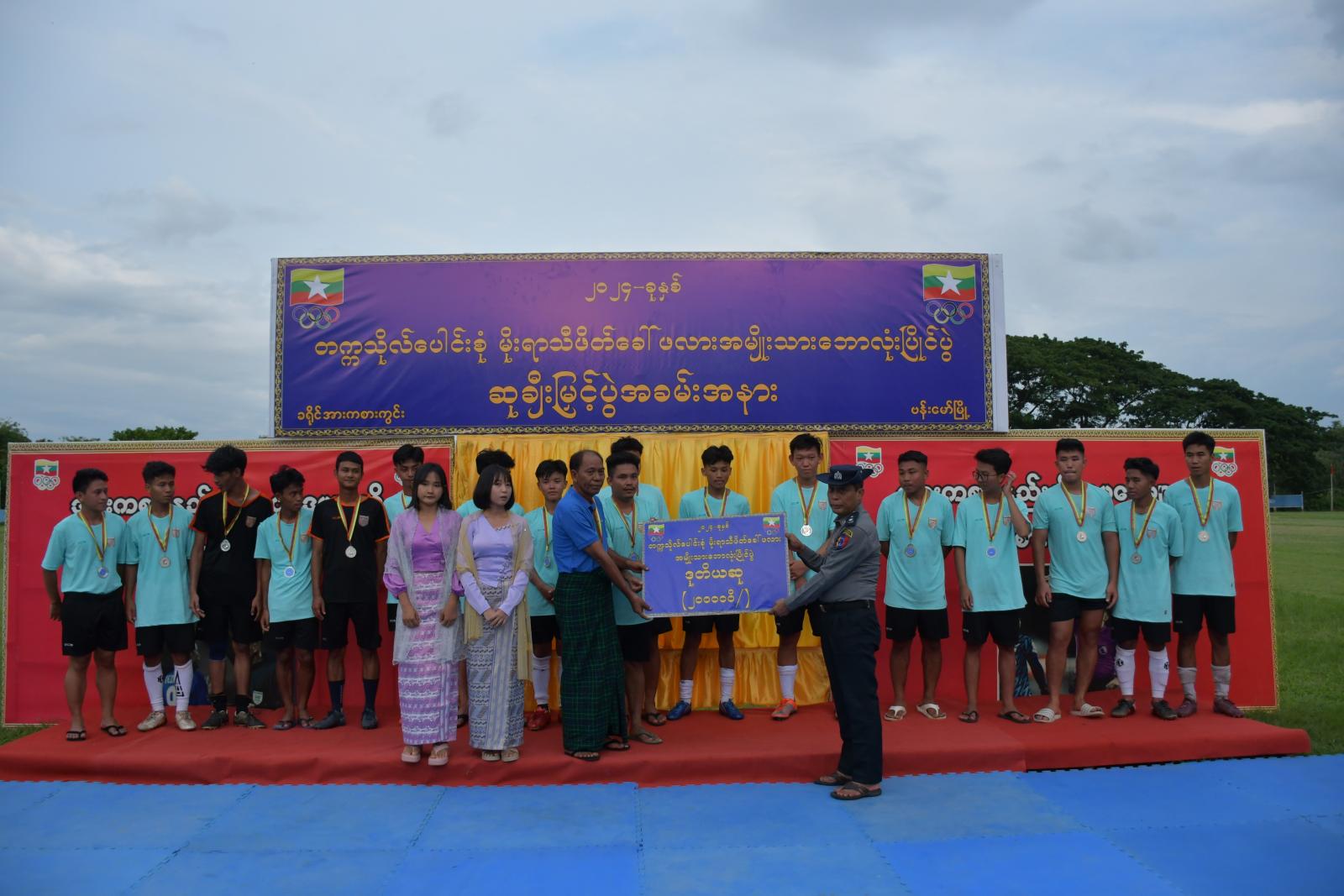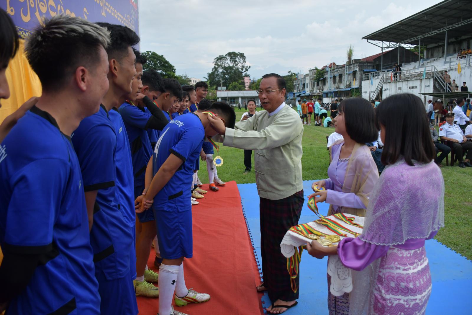 ဆက်လက်၍ အဆိုပါဘောလုံးပြိုင်ပွဲဆုပေးပွဲကျင်းပရာ ပထမဆုရရှိသည့် ဗန်းမော်တက္ကသိုလ်အသင်းအား ခရိုင်စီမံအုပ်ချူပ်ရေးအဖွဲ့ဥက္ကဋ္ဌ ဦးအောင်ဇော်လတ်ကလည်းကောင်း၊ ဒုတိယဆုရရှိသည့် နည်းပညာတက္ကသိုလ်(ဗန်းမော်)အသင်းအား ခရိုင်ရဲတပ်ဖွဲ့မှူး ဒုတိယရဲမှူးကြီးရဲဝင်းကလည်းကောင်း၊ တတိယဆုရရှိသည့် ကွန်ပျူတာတက္ကသိုလ်(ဗန်းမော်)အသင်းအား ခရိုင်စီမံအုပ်ချူပ် ရေးအဖွဲ့ဝင် ဦးဖော်လုလဝမ်ကလည်းကောင်း ဆုများပေးအပ်ချီးမြှင့်ခဲ့ကြပြီး၊ နည်းပညာတက္ကသိုလ်(ဗန်းမော်)မှ ဒုတိယပါမောက္ခကြီး ဒေါက်တာဇော်ဝင်းအောင်က ဆီမီးဖိုင်နယ်နှင့်ဗိုလ်လုပွဲတို့တွင် ပါဝင်ကူညီပေးခဲ့သည့် ဒိုင်၊ လိုင်းနတ်များကိုလည်း ဂုဏ်ပြုလက်ဆောင်များ အသီးသီးပေးအပ် ချီးမြှင့်ခဲ့ကြောင်း သိရသည်။