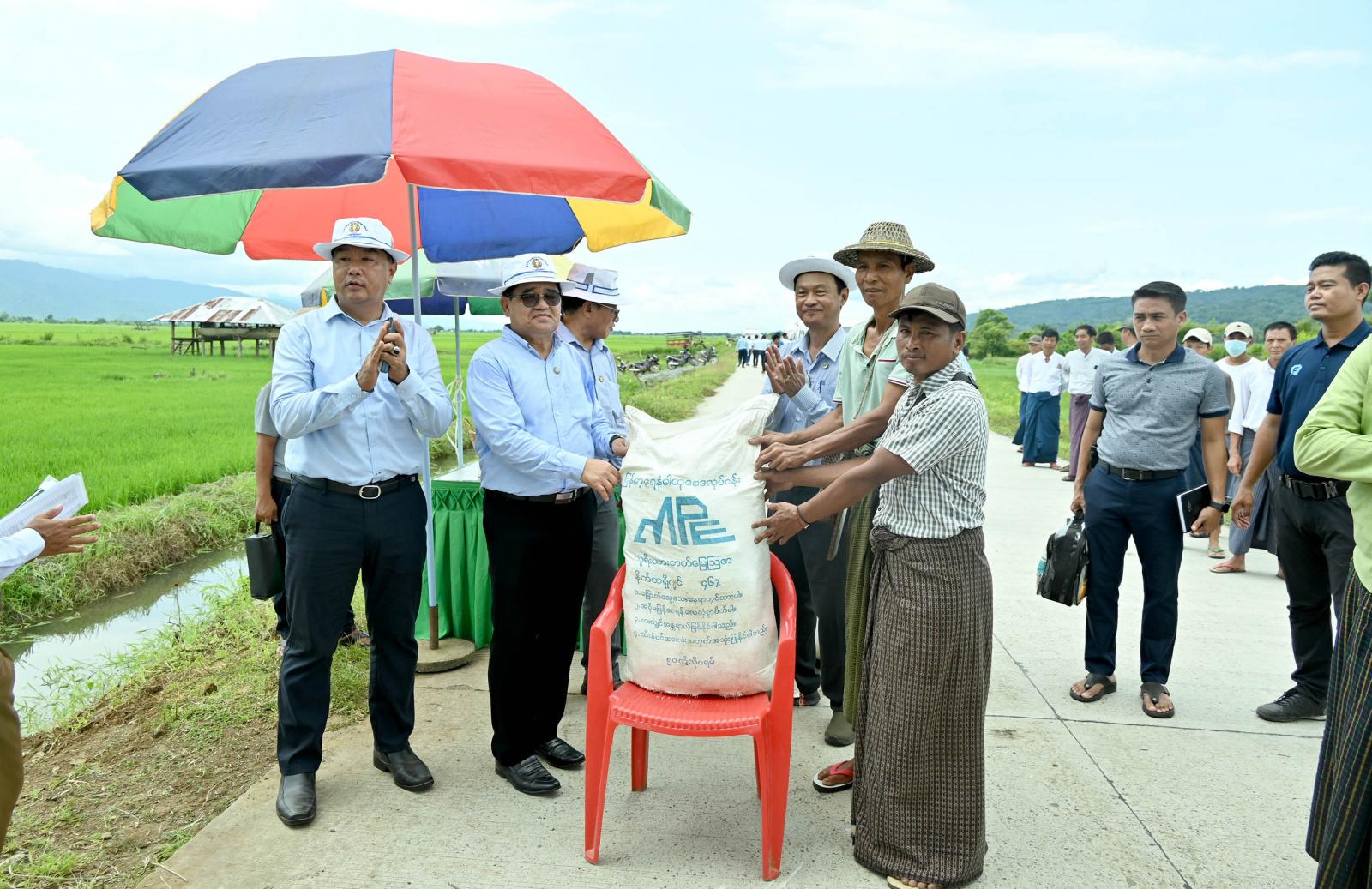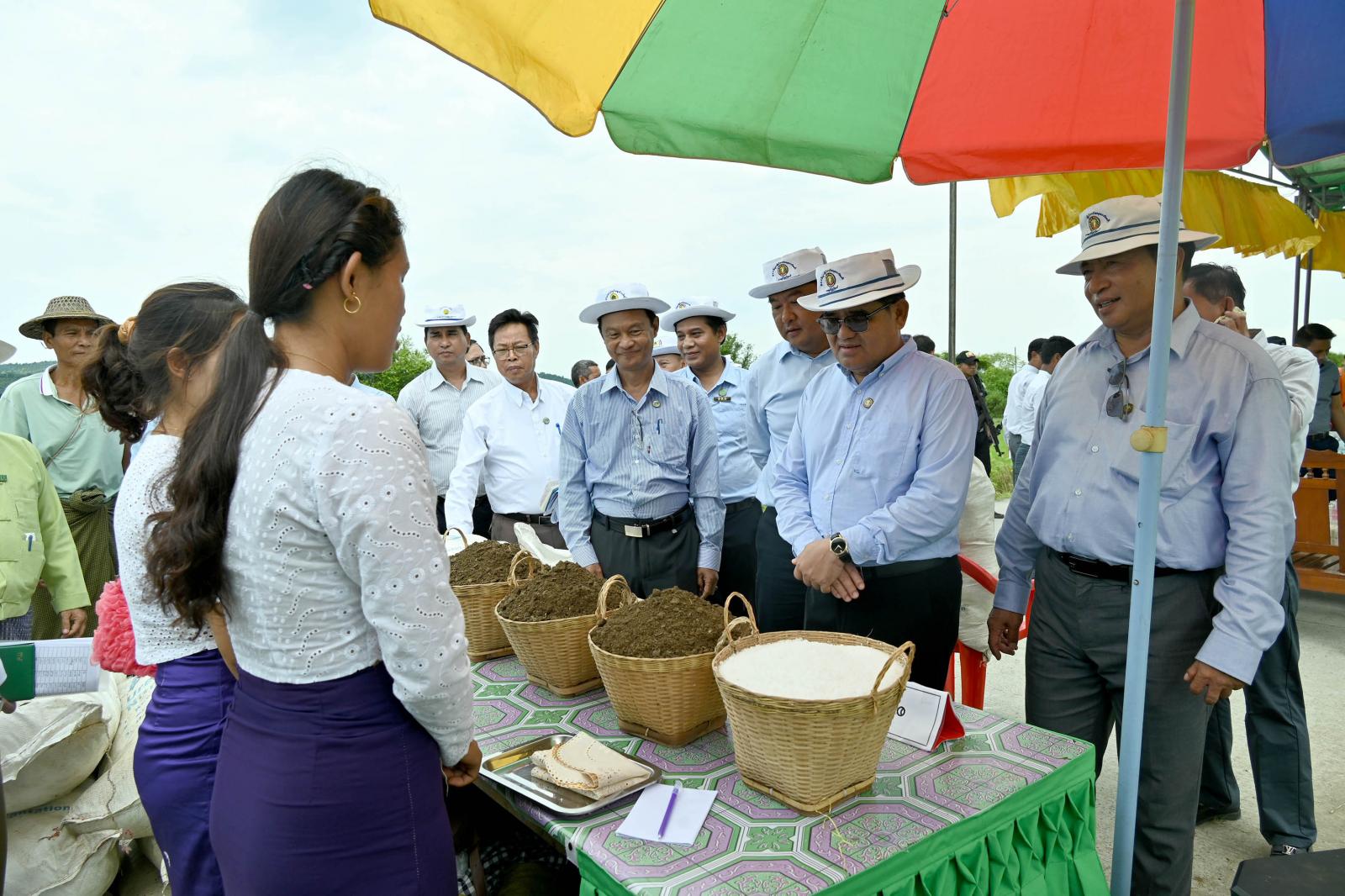 ဆက်လက်၍ စိုက်ပျိုးရေးဦးစီးဌာန၊ ဝန်ထမ်းများက တောင်သူများအား ဓာတ်မြေသြဇာနှင့် သဘာဝမြေသြဇာ အချိုးကျရောစပ်အသုံးပြုနိုင်ရေး အသိပညာပေးဆောင်ရွက်ထားရှိမှုနှင့် တောင်သူ ဦးကျော်မောင်၏ မိုးစပါးစီးပွားဖြစ် မျိုးစေ့ထုတ် စံပြ စိုက်ခင်းအတွင်း ဆင်းဧကရီ-၃ အထွက်တိုး မျိုးစပါး စိုက်ခင်းအတွင်း ဓာတ်မြေသြဇာနှင့် သဘာဝမြေသြဇာအချိုးကျရောစပ်ကြဲပက် သရုပ်ပြသမှု ကို ဒေသခံတောင်သူများနှင့်အတူ ကြည့်ရှုအားပေးခဲ့ကြသည်။