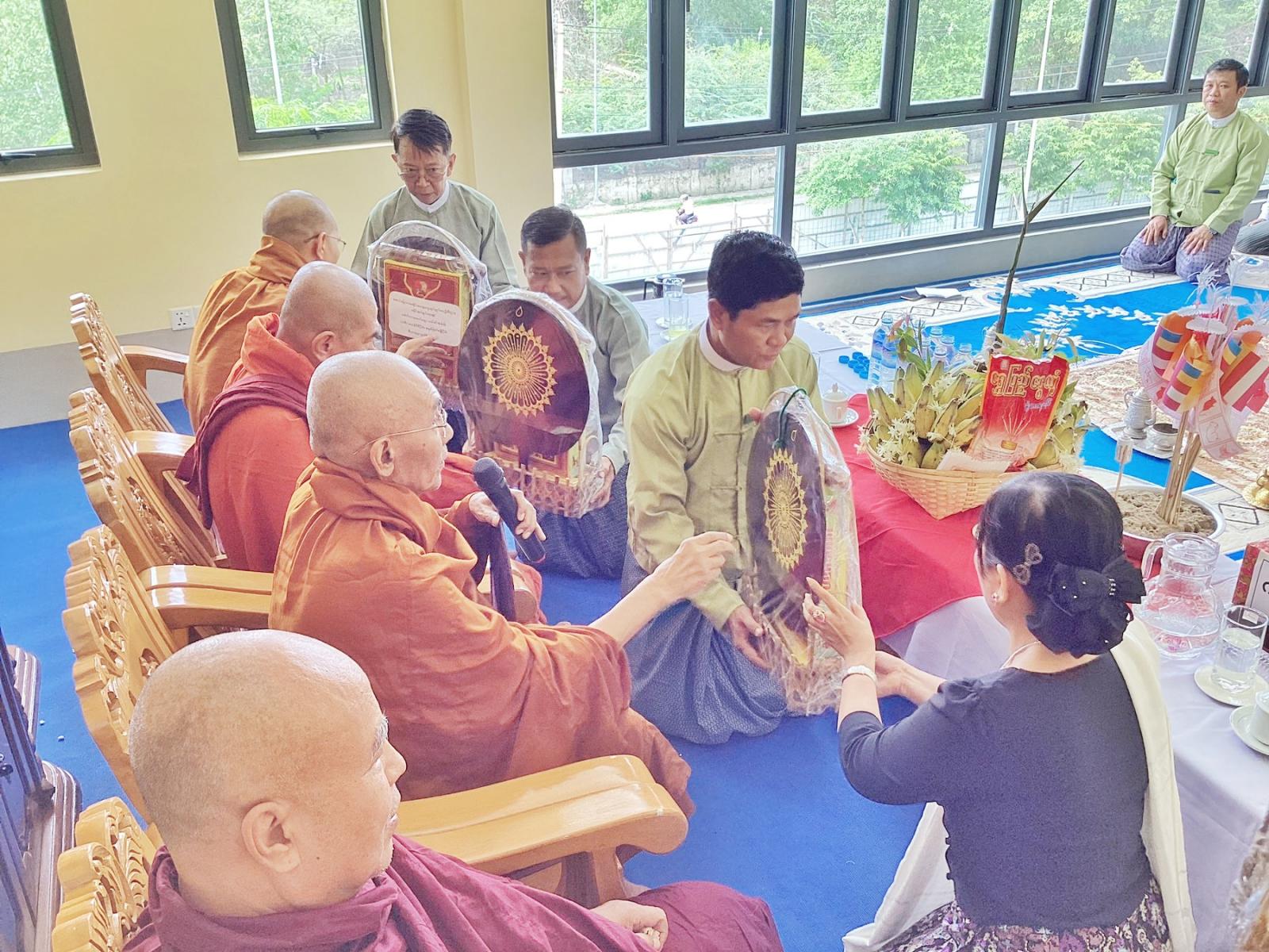 ၎င်းနောက် ကျောင်းထိုင်ဘုန်းကြီးသင်တန်းကျောင်းတွင် ကျောင်းအုပ်ဆရာတော် အမှူးပြုသော သင်တန်းကထိကနည်းပြဆရာတော်နှင့် သံဃာတော်များတို့အား နေ့ဆွမ်းဆက်ကပ်ပြီး အောင်မြေသာစံခရိုင် စီမံအုပ်ချုပ်ရေးအဖွဲ့ဥက္ကဋ္ဌ ဒေါက်တာအောင်ဆွေ+ဒေါ်ခင်အုန်းမြ(သမီး) မဟန်မီမီငြိမ်း၊ မချစ်မြတ်စန္ဒီငြိမ်း မိသားစုတို့က ရာသက်ပန်ဆွမ်းပဒေသာပင် အလှူငွေအဖြစ် ယခင်လှူဒါန်းငွေကျပ်(၁၅)သိန်း၊ ယခုလှူဒါန်းငွေကျပ်(၁၀)သိန်း စုစုပေါင်းငွေကျပ်(၂၅)သိန်းကို ပေးအပ်လှူဒါန်းရာ ဥပတ္ထမ္ဘကအဖွဲ့အတွင်းရေးမှူးဦးမျိုးဝင်းနိုင်က လက်ခံရယူပြီး သာဓုအနုမောဒနာ ဂုဏ်ပြုမှတ်တမ်းလွှာကို ပြန်လည်ပေးအပ်ကြောင်း သိရသည်။