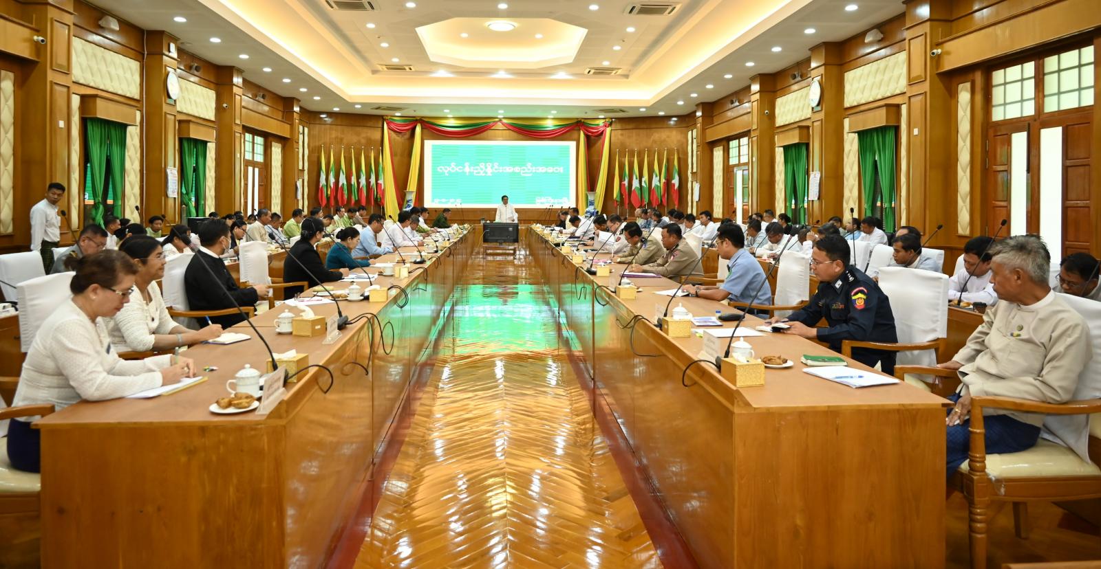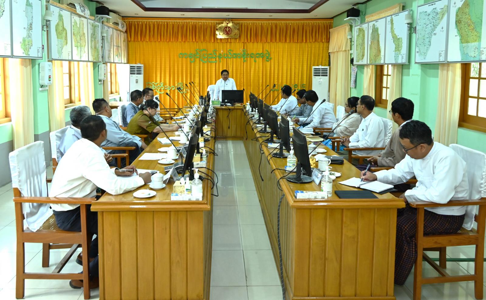 ထို့နောက် တက်ရောက်လာကြသည့် ပြည်နယ်တရားလွှတ်တော်တရားသူကြီးချုပ်၊ ပြည်နယ်အစိုးရအဖွဲ့ဝင်များနှင့် ပြည်နယ်အဆင့်ဌာနဆိုင်ရာများက လုပ်ငန်းကဏ္ဍအလိုက် ပြည်ထောင်စုဘဏ္ဍာ၊ ပြည်နယ်ဘဏ္ဍာရန်ပုံငွေများဖြင့် ဘဏ္ဍာနှစ်အလိုက် ဦးစားပေးအစီအစဉ်ဖြင့် အကောင်အထည်ဖော်ဆောင်ရွက်လျက်ရှိသည့် လုပ်ငန်းစီမံကိန်းများ၊ ရှေ့လုပ်ငန်းစဉ်များ၊ လိုအပ်ချက်၊ အခက်အခဲများနှင့် မြေပြင်အခြေအနေများအပေါ် ပေါင်းစပ်ဆောင်ရွက်ပေးရမည့် ကိစ္စရပ်များအပေါ် ပါဝါပွိုင့်များဖြင့် ရှင်းလင်းတင်ပြကြရာ ပြည်နယ်အစိုးရအဖွဲ့အတွင်းရေးမှူးက နိုင်ငံတော်စီမံအုပ်ချုပ်ရေးကောင်စီ၏ လမ်းညွှန်ချက်၊ ညွှန်ကြားချက်များအပေါ် အသေးစိတ်လိုက်နာ အကောင်အထည်ဖော်ရမည့်ကိစ္စရပ်များ၊ တင်ပြချက်များအပေါ် ဖြည့်စွက်သုံးသပ် ရှင်းလင်းတင်ပြသည်။