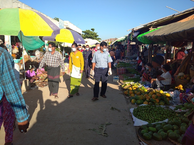 ထိုသို့ဆောင်ရွက်ရာတွင် ဈေးတာဝန်ခံ ဦးလှိုင်ဝင်းဆွေနှင့်တာဝန်ရှိသူများက ဈေးအတွင်းသို့ လှည်လည့််၍ ကျန်းမာရေးနှင့်အားကစားဝန်ကြီးဌာနမှ ထုတ်ပြန်ထားသည့် ကိုဗစ်၁၉ရောဂါ ကြိုတင် ကာကွယ်ရေး နည့်လမ်းများ အား ဈေးရောင်း၊ဈေးဝယ်ပြည်သူများ သိရှိလိုက်နာစေရေး ရှင်းလင်းပြောကြား ခြင်းများ ပြုလုပ်ခဲ့ပြီး နှာခေါင်းစည်းမပါသည့် ပြည်သူများအား နှာခေါင်းစည်းတစ်ခုလျှင် (၂၀၀)ကျပ်ဖြင့် ရောင်းချကာ အခုဝယ်၊ အခုတပ် စနစ်ဖြင့် ပညာပေးခြင်းများ ဆောင်ရွက်ခဲ့ကြောင်း သိရှိရသည်။