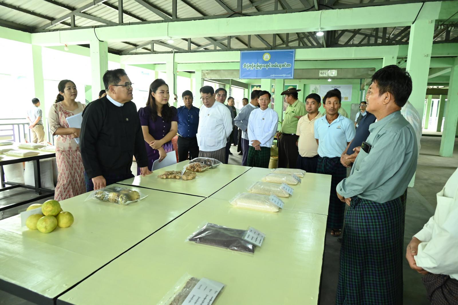 ထိုသို့ ကွင်းဆင်းစစ်ဆေးရာတွင် ပြည်နယ်ဝန်ကြီးချုပ်သည် ပြည်နယ်တရားလွှတ်တော်တရားသူကြီးချုပ် ဦးတူးဂျာ၊ ပြည်နယ်အစိုးရအဖွဲ့ဝင်များ၊ ပြည်နယ်အဆင့်ဌာနဆိုင်ရာ တာဝန်ရှိသူများနှင့်အတူ အဆင့်မြင့်ဈေး အဆောင်(ဒီ) ဒုတိယထပ်တွင် စိုက်ပျိုးထုတ်လုပ်သည် တောင်သူများ၊ လုပ်ငန်းရှင်များ၊ ရောင်းဝယ်ဖောက်ကားသည့် ကုန်သည်များ၊ ကြိတ်ခွဲထုတ်လုပ်သည့် စက်ပိုင်များပါဝင်သည့် ပြည်နယ်စိုက်ပျိုးတောင်သူ၊ ကုန်သည်၊ စက်ပိုင်များအသင်း ကုန်စည်ဒိုင် စတင်ဖွဲ့စည်းပြီး ရုံးခန်းဖွင့်လှစ်၍ စိုက်ပျိုးရေးထုတ်ကုန်များဖြစ်သည့် ဆန်စပါး၊ ပဲအမျိုးမျိုး၊ ကြက်သွန်ဖြူ/နီ၊ ဒေသထွက် အသီးအနှံကုန်စည်များအား စုဆောင်းသိုလှောင်ပြီး ဖြန့်ဖြူးခြင်းရောင်းချခြင်းလုပ်ငန်းများ ဆောင်ရွက်သွားမည့်အစီအစဉ်များကို အသင်းတာဝန်ရှိသူများက လိုက်လံရှင်းလင်းတင်ပြမှုကို လှည့်လည်ကြည့်ရှုစစ်ဆေးခဲ့ကြပြီး ပြည်နယ်ဝန်ကြီးချုပ်က အသင်း/အဖွဲ့ မှတ်ပုံတင် အမြန်ဆုံးရရှိအောင် ကူညီပေးနိုင်ရေး၊ ကုန်စည်များ ဖြန့်ဖြူးသိုလှောင်ရောင်းချရာတွင် ဈေးကွက်စနစ်မှန်ကန်ပြီး တောင်သူများ အမှန်တကယ်အကျိုးဖြစ်ထွန်းရေးကို ဦးတည်ဆောင်ရွက်ကြရေးနှင့် လိုအပ်သည်များကို ပံ့ပိုးကူညီပေးနိုင်ရေး ဌာနဆိုင်ရာတာဝန်ရှိသူများနှင့် ပေါင်းစပ်ညှိနှိုင်း ဖြေရှင်းဆောင်ရွက်ပေးခဲ့သည်။