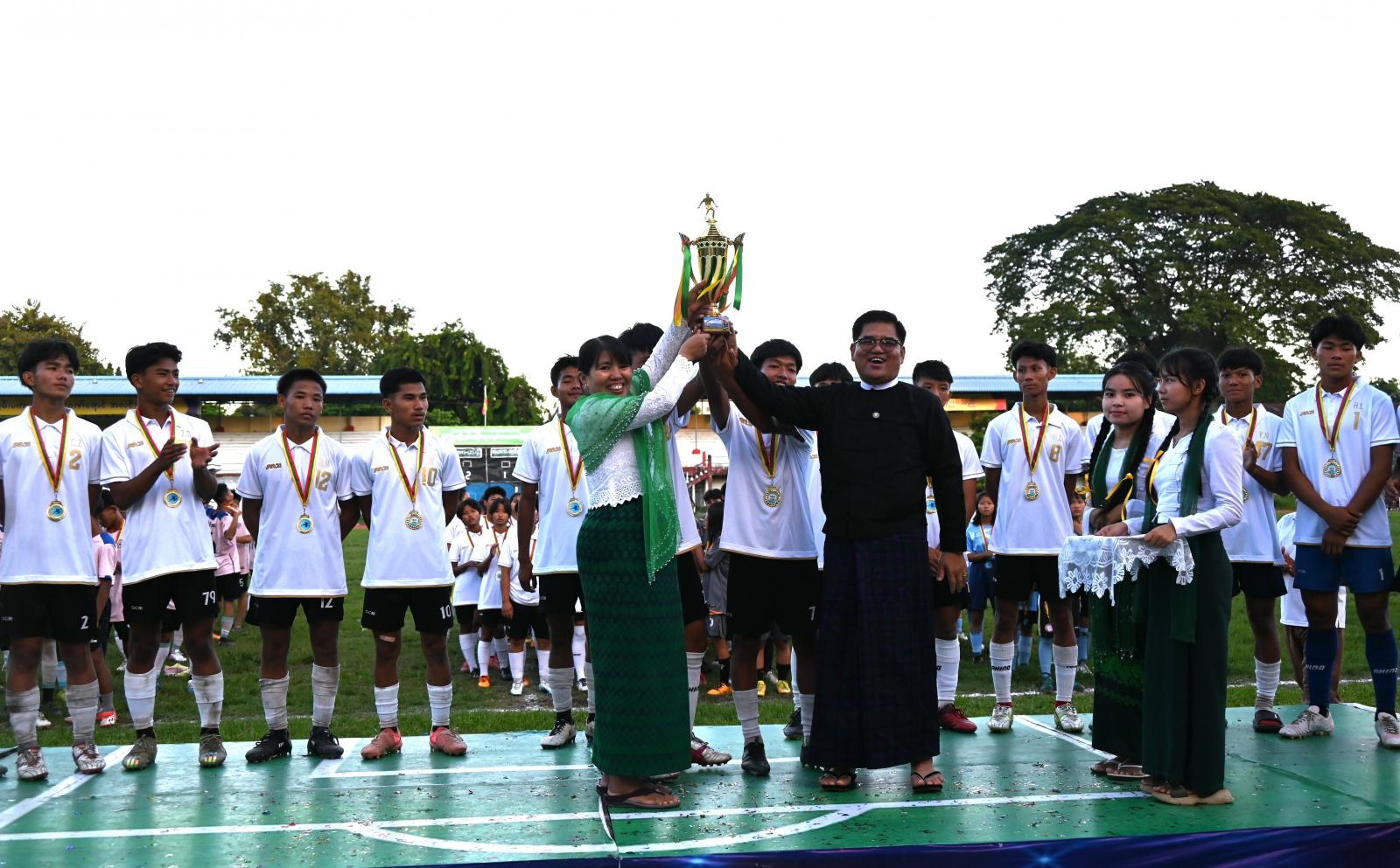 ထို့နောက် ပြည်နယ်ဝန်ကြီးချုပ်၏ဇနီးနှင့် ပြည်နယ်တရားလွှတ်တော်တရားသူကြီးချုပ်၏ဇနီးတို့က ပထမဆုရ အမျိုးသမီးဘောလုံးအသင်းအတွက် တစ်ဦးချင်းလည်ဆွဲဆုတံဆိပ်၊ ပထမတံခွန်စိုက်ဆုဖလားနှင့် ဂုဏ်ပြုချီးမြှင့်ငွေများကိုလည်းကောင်း၊ ပြည်နယ်တရားလွှတ်တော်တရားသူကြီးချုပ်က ပထမဆုရ အမျိုးသားဘောလုံးအသင်းအတွက် တစ်ဦးချင်းလည်ဆွဲဆုတံဆိပ်များကိုလည်းကောင်း၊ ပြည်နယ်ဝန်ကြီးချုပ်က ပထမဆုရအသင်းအတွက် တံခွန်စိုက်ဆုဖလားနှင့် ဂုဏ်ပြုချီးမြှင့်ငွေများကိုလည်းကောင်း အသီးသီးပေးအပ်ချီးမြှင့်ခဲ့ကြကြောင်း သိရသည်။