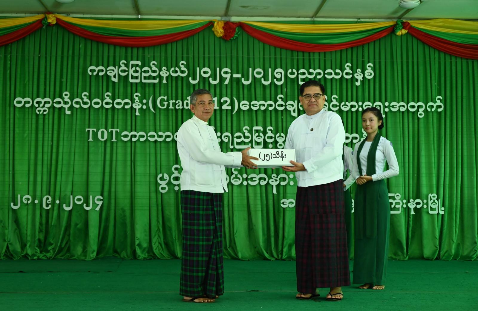 ထို့နောက် ပြည်နယ်ဝန်ကြီးချုပ်နှင့်အဖွဲ့ဝင်များသည် အမှတ်(၉)အခြေခံပညာအထက်တန်းကျောင်း၊ ရွှေသွေးခန်းမ၌ ပြည်နယ်အတွင်းရှိ အခြေခံပညာကျောင်းအုပ်ကြီးများ၊ အထက်တန်းအဆင့်သင် ဆရာ၊ ဆရာမ(၂၀၀)ကျော်တို့အား မြစ်ကြီးနားတက္ကသိုလ်မှ ပါမောက္ခဌာနမှူးများက (၂)ရက်ကြာ ဖွင့်လှစ်ပို့ချသွားမည့် ကချင်ပြည်နယ်၏ ၂၀၂၄-၂၀၂၅ ပညာသင်နှစ် တက္ကသိုလ်ဝင်တန်း Grade-12 အောင်ချက်မြင့်မားရေးအတွက် TOT ဘာသာရပ်စွမ်းရည်မြှင့်မွမ်းမံသင်တန်းဖွင့်ပွဲအခမ်းအနားသို့ တက်ရောက်သည်။
