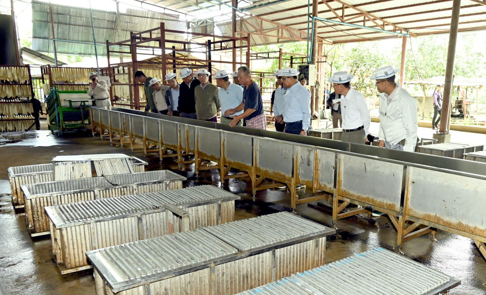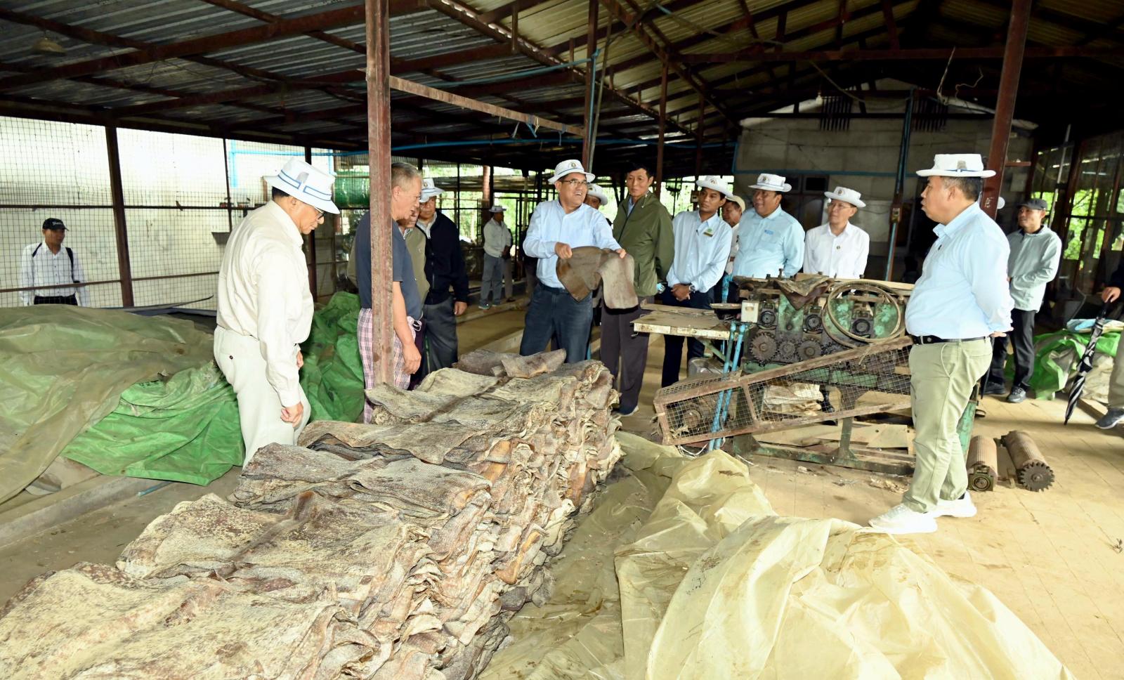 ထိုသို့ ကွင်းဆင်းစစ်ဆေးရာတွင် ပြည်နယ်ဝန်ကြီးချုပ်သည် ပြည်နယ်အစိုးရအဖွဲ့ဝင် ဝန်ကြီးများ၊ ပြည်နယ်အစိုးရအဖွဲ့အတွင်းရေးမှူးနှင့် နိုင်ငံ့စီးပွားမြှင့်တင်ရေးရန်ပုံငွေဖြင့် စိုက်ပျိုးမွေးမြူရေး ဆောင်ရွက်သော ပြည်နယ်အဆင့် ကျေးရွာစီမံကိန်းကြီးကြပ်မှုကော်မတီအဖွဲ့ဝင်များနှင့်အတူ နိုင်ငံ့စီးပွားမြှင့်တင်ရေး ရန်ပုံငွေပထမနှစ်စက်ဝန်းမှ နှစ်ရှည်သီးနှံအတွက် (၃)နှစ်စီမံကိန်းဖြင့် ချေးငွေကျပ်သန်း (၁၀၀)ဖြင့် အဆင့်မြှင့်တင်ဆောင်ရွက်လျက်ရှိသည့် တောင်သူ ဦးအောင်ဆွေ၏ ရော်ဘာခြံ ဧက ၆၀၀ ကျော်အတွင်းရှိ စက်ရုံ၌ ရော်ဘာစေးများခြစ်ယူ၍ အစေးရည်စုဆောင်းပြီး ရော်ဘာပြား များကြိတ်ခြင်း၊ မှိုင်းခံခြင်း၊ မီးပူပေးစက်ဖြင့် အဆင့်(၃)ရာဘာပြားများအထိ တိုးမြှင့်ထုတ်လုပ်လျက်ရှိ သည့်အခြေအနေများကို လှည့်လည်ကြည့်ရှုစစ်ဆေးခဲ့ကြသည်။