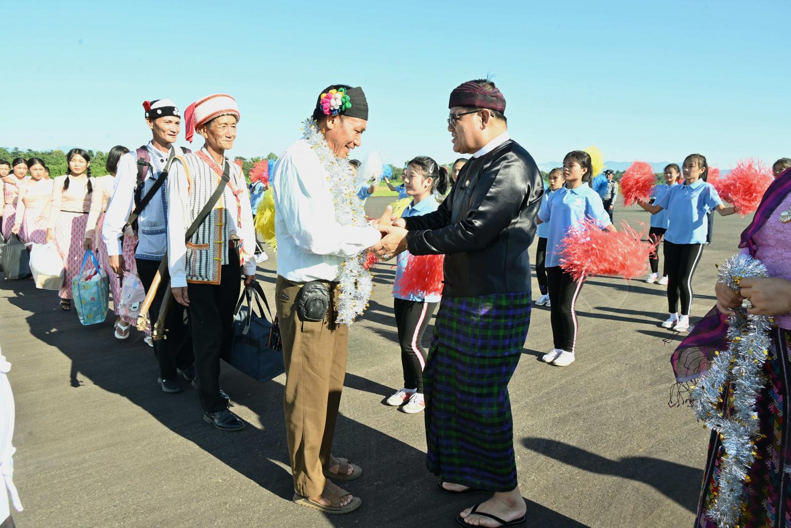 ထိုသို့ ဂုဏ်ပြုကြိုဆိုရာသို့ ပြည်နယ်ဝန်ကြီးချုပ် ဦးခက်ထိန်နန်နှင့် ဇနီးဒေါ်နန်ဆိုင်း၊ ပြည်နယ်တရားလွှတ်တော်တရားသူကြီးချုပ် ဦးတူးဂျာနှင့် ဇနီး၊ ပြည်နယ်အစိုးရအဖွဲ့ဝင်ဝန်ကြီးများနှင့် ၎င်းတို့ ၏ဇနီးများ၊ ပြည်နယ်ဥပဒေချုပ်၊ ပြည်နယ်အစိုးရအဖွဲ့အတွင်းရေးမှူး၊ ပြည်နယ်အဆင့်ဌာနဆိုင်ရာ များ၊ အေရိုးဗစ်အကအဖွဲ့များ၊ မိဘဆရာများ၊ ကျောင်းသား/ ကျောင်းသူများက ပြန်လည်ရောက်ရှိ လာသော ဗဟိုအဆင့်ပြိုင်ပွဲဝင် အောင်ပွဲရပြည်နယ်ကိုယ်စားပြု အနုပညာရှင်မောင်/မယ်များအား ဂုဏ်ပြုပန်းကုံးများဖြင့် စည်ကားသိုက်မြိုက်စွာ ဂုဏ်ပြုကြိုဆိုခဲ့ကြသည်။